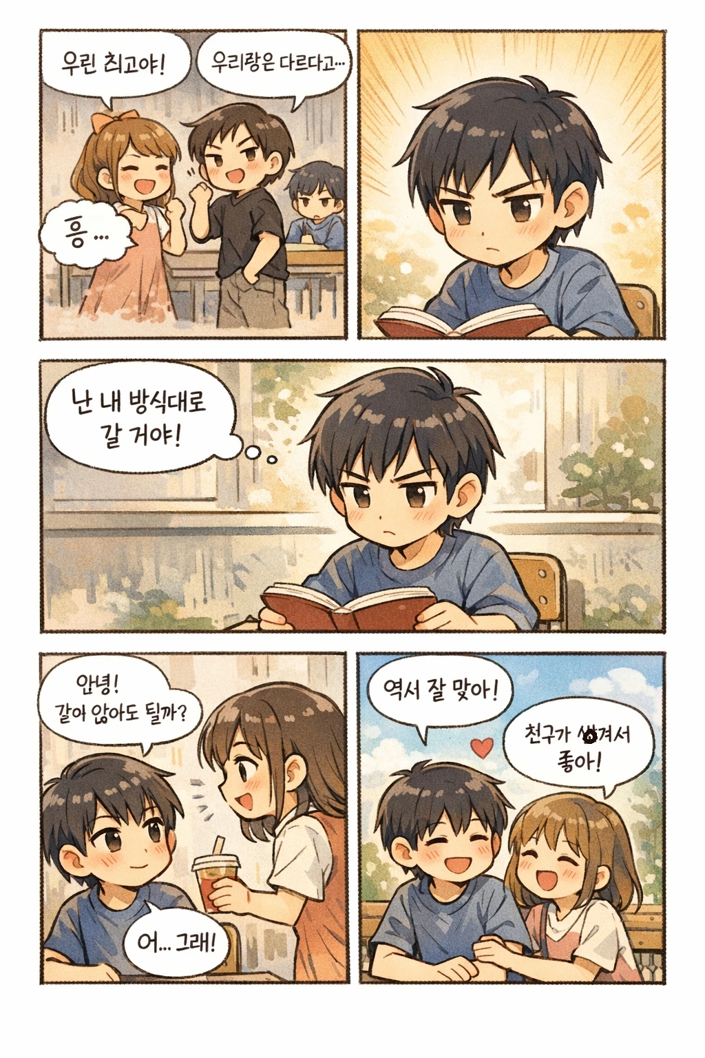 AI4컷 만화 왕따를 당해도 내길을가면 친구가 생생긴