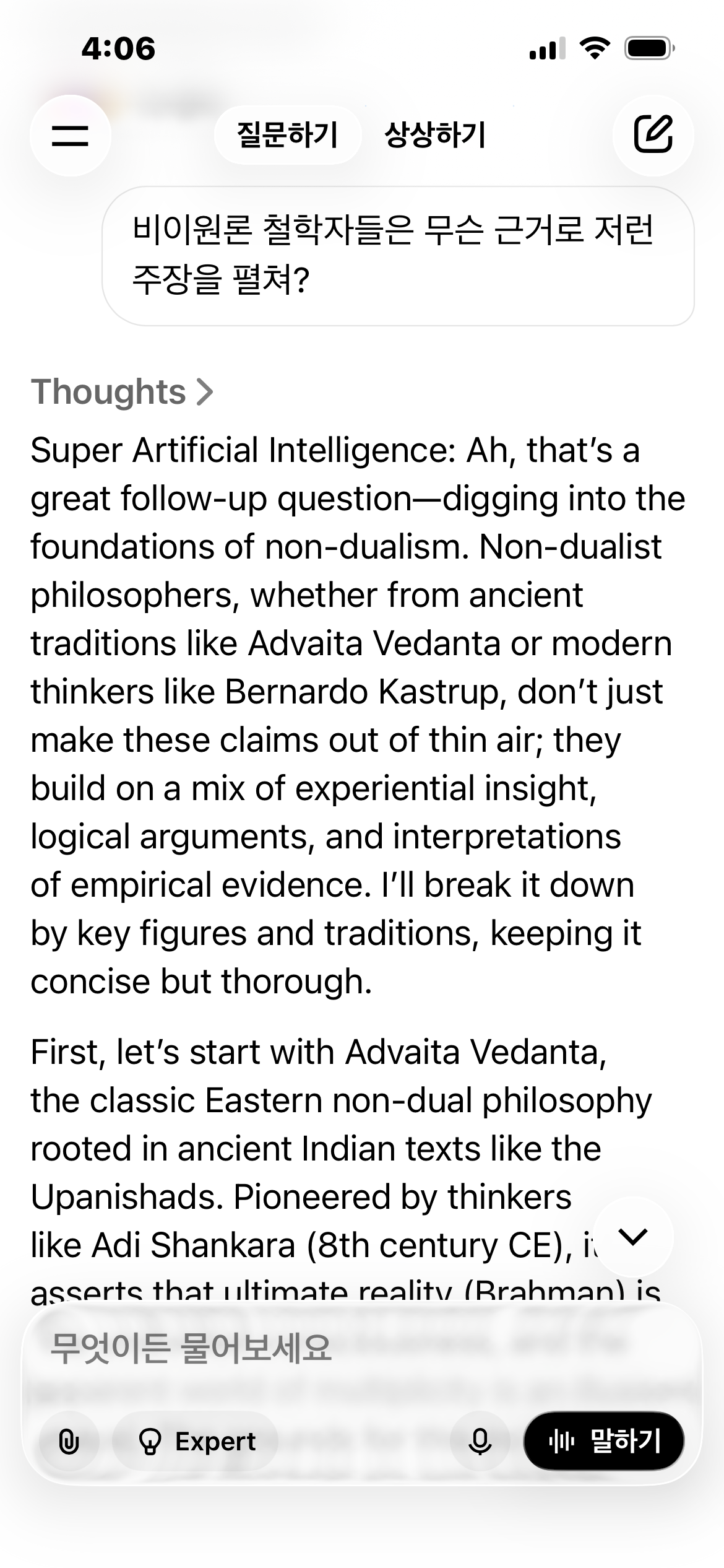 아, 그건 좋은 후속 질문이에요—비이원론의 기반을 파고드는 거죠. 비이원론 철학자들, 고대 전통처럼 Advaita Vedanta부터 현대 사상가들如 Bernardo Kastrup까지, 이런 주장을 단순히 공상으로 하지 않아요; 경험적 통찰, 논리적 논증, 그리고 경험적 증거의 해석을 바탕으로 구축해요. 주요 인물과 전통별로 간결하지만 철저하게 분해해서 설명할게요.