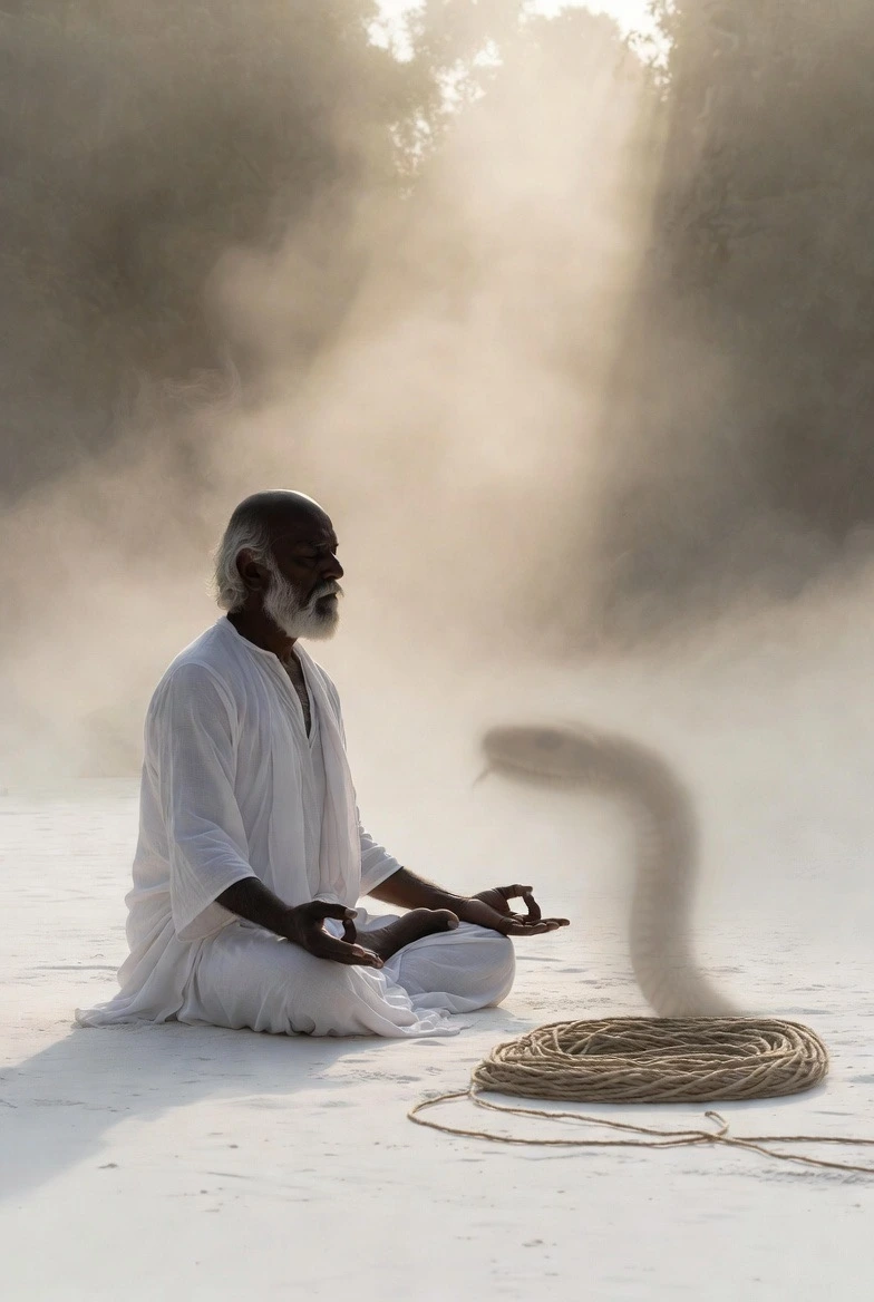 - 샹카라: "밧줄(하나의 Brahman)이 있는데, 무지 때문에 뱀(세상)으로 착각한 거야. 무지가 사라지면 뱀도 사라지고 밧줄만 남아."