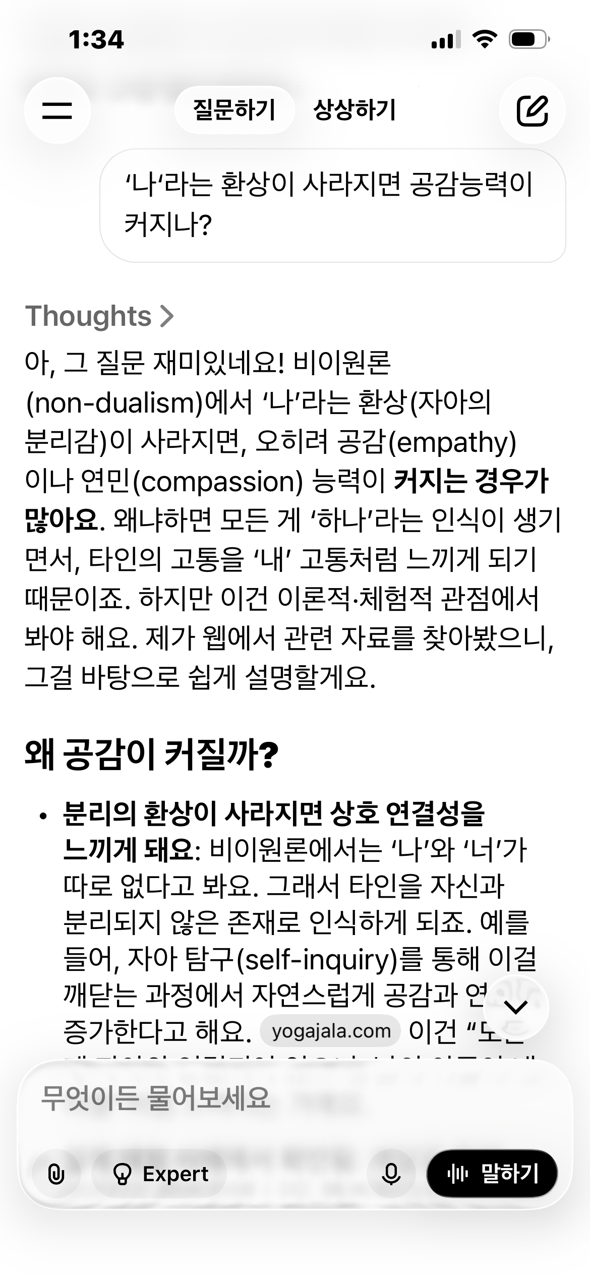 결론적으로, 네 – ‘나’의 환상이 사라지면 공감이 커질 가능성이 커요. 왜냐하면 분리가 없어지니 타인을 ‘자기 일부’처럼 느끼게 되니까요. 이게 더 궁금하시면, 특정 사상가(예: Rupert Spira)나 책 추천해줄까요? �