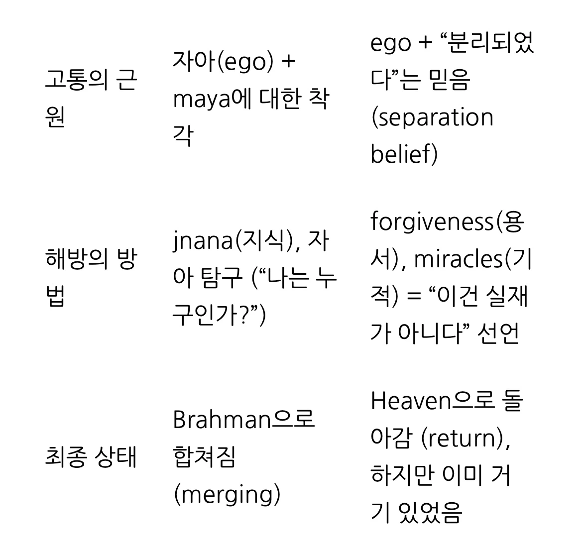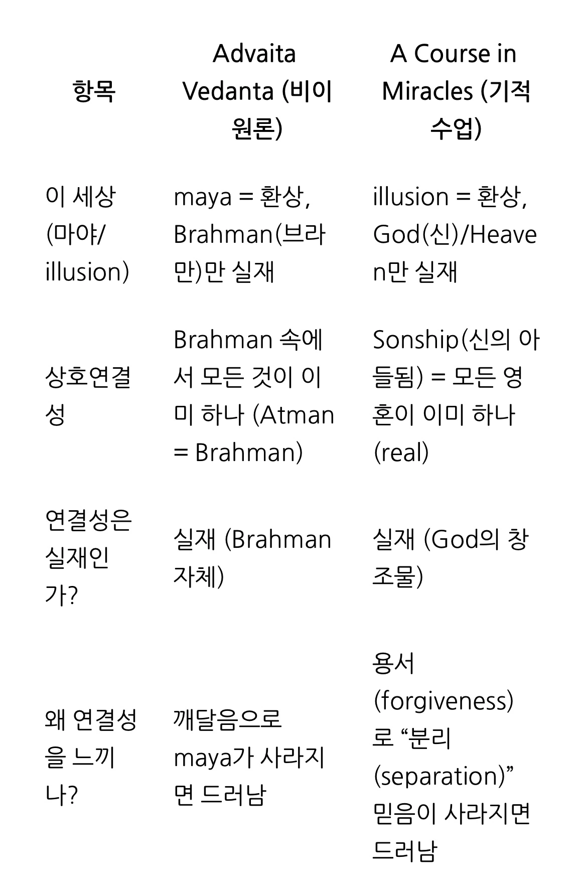 즉, ACIM은maya가 사라지면 Brahman이 드러난다”와 거의 똑같지만, ACIM은 “용서”라는 감정적·실천적 도구를 더 강조함)