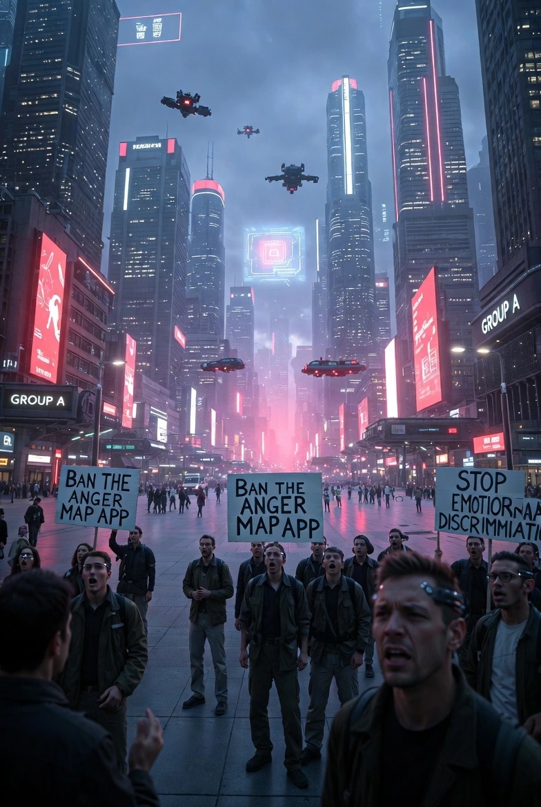 이 응용앱이 나오자 전체 인구의 2/3의 사람들이 이 분노 지도 앱(줄여서 ‘분지앱‘)을 사용했다. 사람들은 지도상의 빨갛게 표시된 지역은 피해 다녔고 길을 걷다가도 분노지수가 높은 사람이 멀리서 걸어오면 그를 피했다.