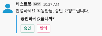 각 이름이 반영되어 메시지가 발송된 모습을 볼 수 있다. 승인/반려를 선택할 수 있는 버튼도 담겼다