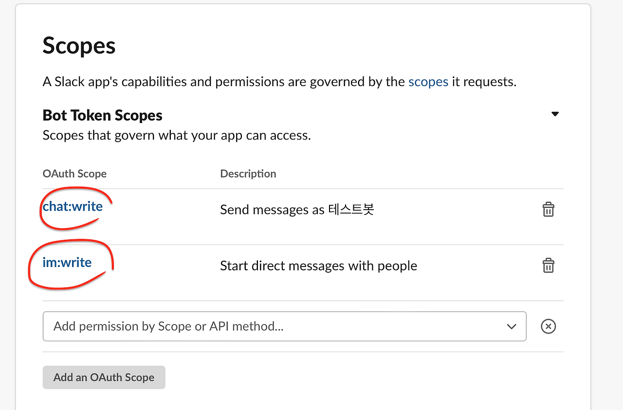 2-3) 좌측 OAuth&Permissions > 하단 Scopes > Add an OAuth Scope를 클릭