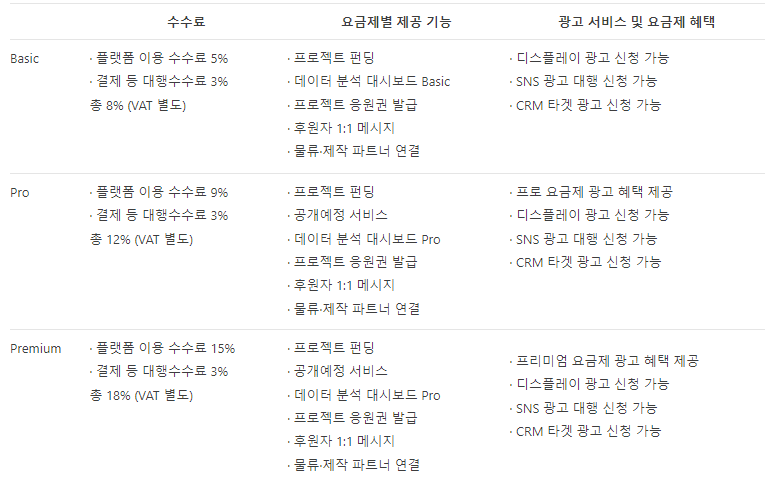 텀블벅의 요금제에 변화가 있었다. 마지막 크라우드펀딩 때는 요금제 구분 없이 5%의 플랫폼 수수료, 3%의 결제 수수료, 부가세 10%라 최대 8.8%의 수수료가 나가는 방식이었는데 몇 가지 편의 서비스와 광고를 더 얹어 3단계의 요금 체계로 개편되었다.