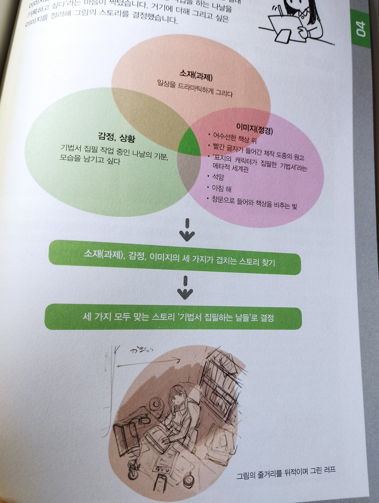 보통 캐릭터에 집중하고 배경 그리는 데 소홀할 수 있는데 이 책은 그렇게 그리기 싫었던 배경에 흥미를 돋우는 책이다. 한 장의 그림에도 스토리를 담아내서 보는 이로 하여금 상상력을 자극하게 되는데 다음과 같은 순서로 접근 방법을 설명하고 있다.