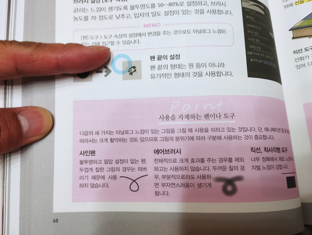 p68 ‘도구 속성의 설정에서 변경을 주는 것으로 아날로그 느낌이 있는 선에 접근할 수 있습니다(ツールプロパティの設定に変更を加えることでも、アナログ感のある線に近づけることができます)’는 의미상 ‘도구 속성의 설정값을 조절하면 아날로그 느낌을 줄 수 있습니다’ 정도면 좋겠다.