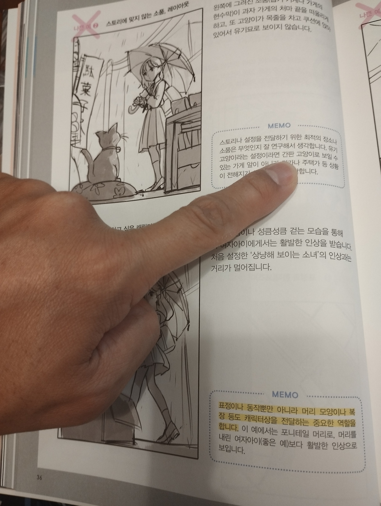 두 표지를 살펴보면 원서가 어필하는 소구점은 ‘스토리가 전달되게 그리는 방법’이고 번역서가 어필하는 소구점은 ‘배경이 있는 캐릭터를 그리는 방법’이란 게 차이점이다.