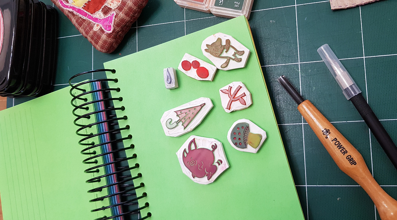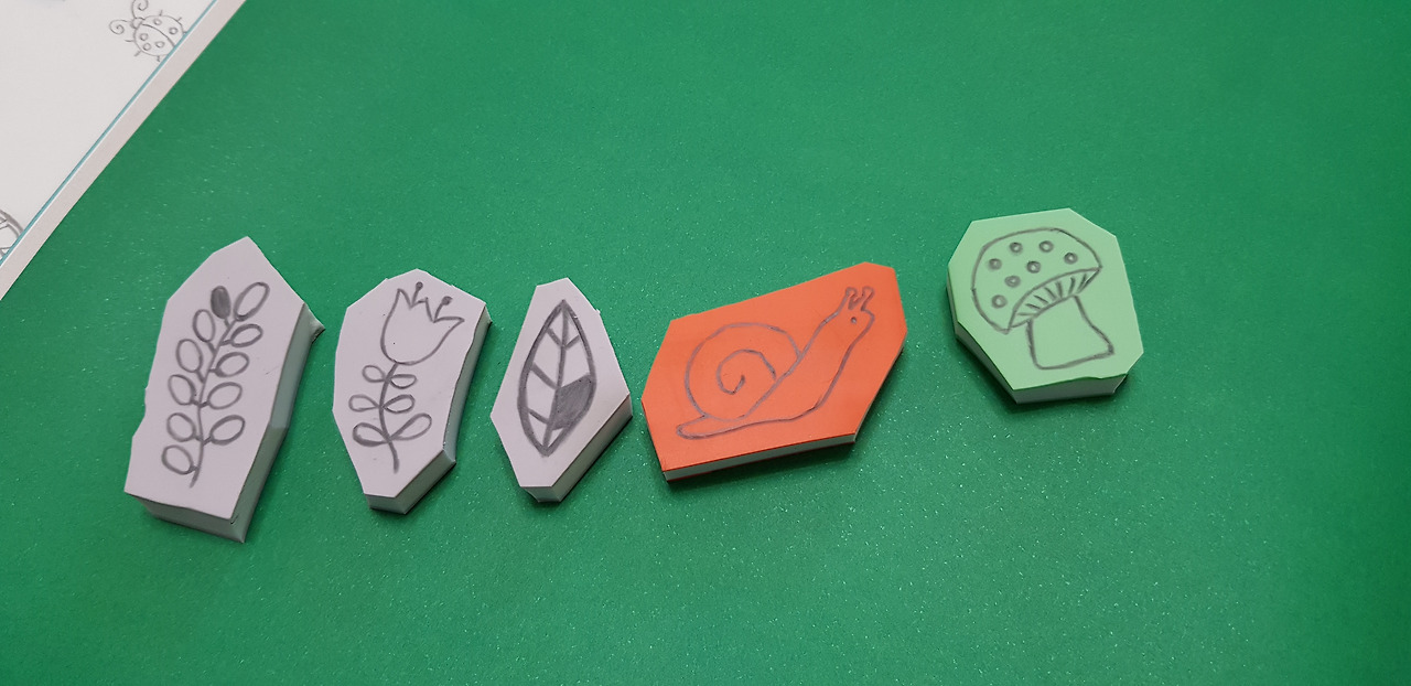 지우개에 트레이싱지를 문질러 모양을 옮겼다. 아트 나이프로 하나씩 판다. 스탬프 파는 방법은 앞 편에 있다.