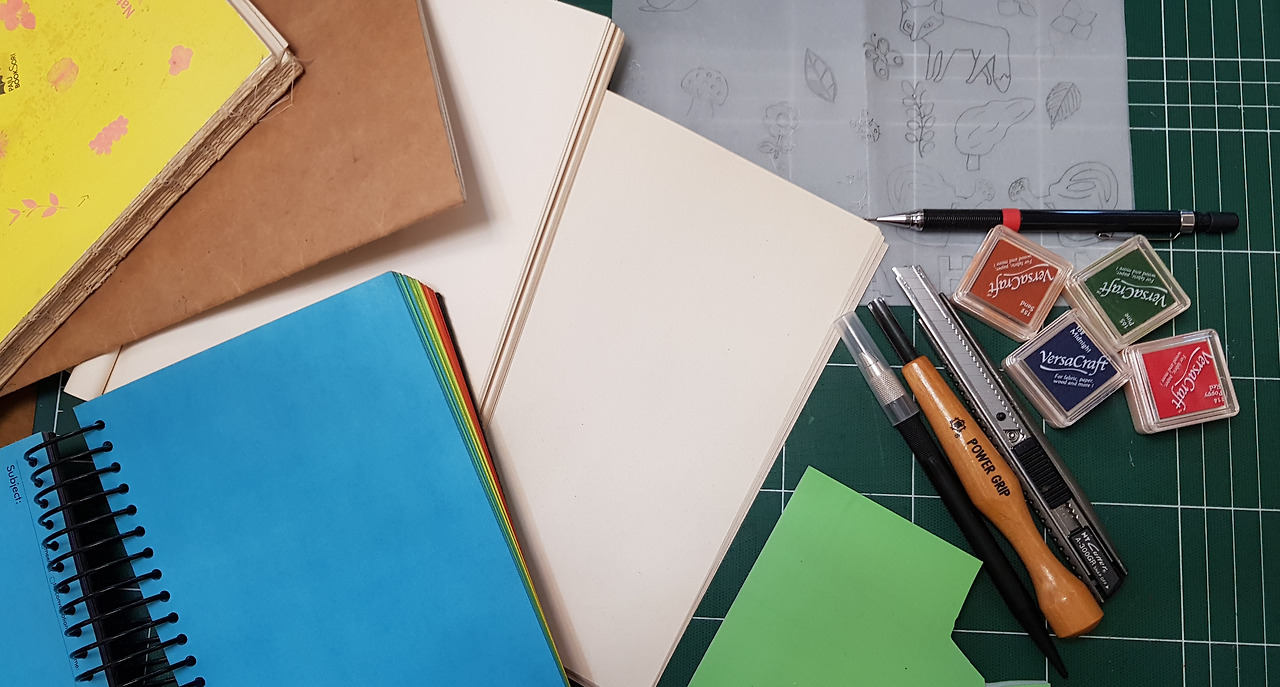 안 쓰는 공책이나 수첩에서 모은 종이와 스탬프 재료들. 집 안을 뒤져보면 종이가 수두룩하다.