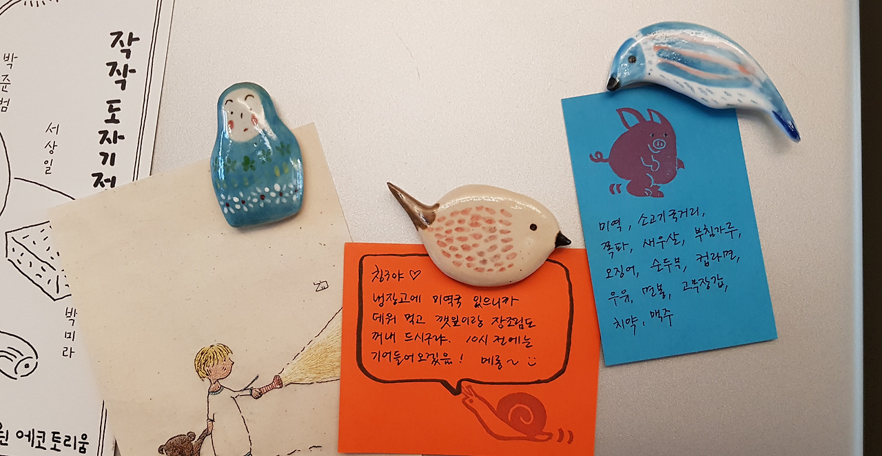 아들이 초등학교 때 쓰던 수첩을 뜯어 메모지를 만들었다. 맨숭맨숭하던 종이에 캐릭터가 생겼다.
