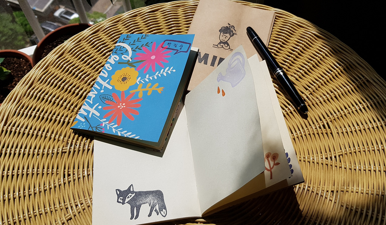 A4용지 절반 정도로 자른 종이를 모아 가운데를 스테이플러로 찍는다. 안쪽에는 마음 가는대로 스탬프를 찍고 표지를 따로 만들어 딱풀로 붙여도 좋다. 딱 손바닥만 해서 가방에 넣고 다녀도 앙증맞고 가볍다.