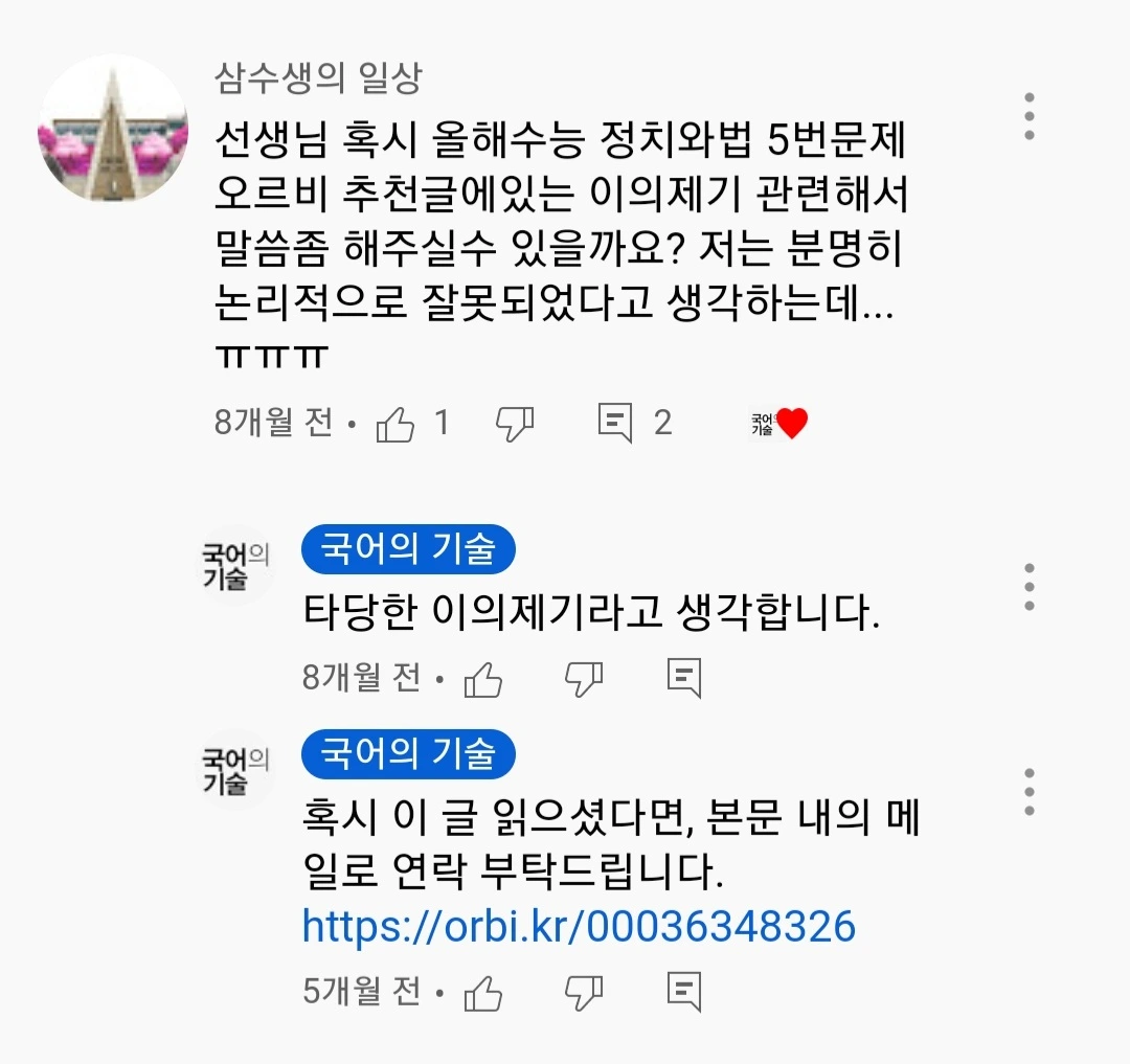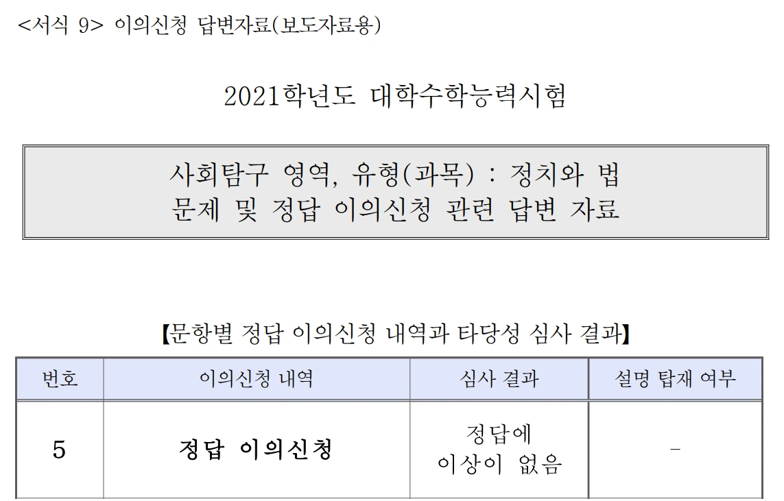 덧: 나중에 안 사실이지만, 정치와 법 강사분들이 학생들의 이의제기에 답변을 피했다고 한다. 이해 못할 바는 아니다. 행여 출제오류라고 주장했는데 출제기관에서 이상 없다고 결론나면, 단순히 개망신으로 끝나지 않으니까...