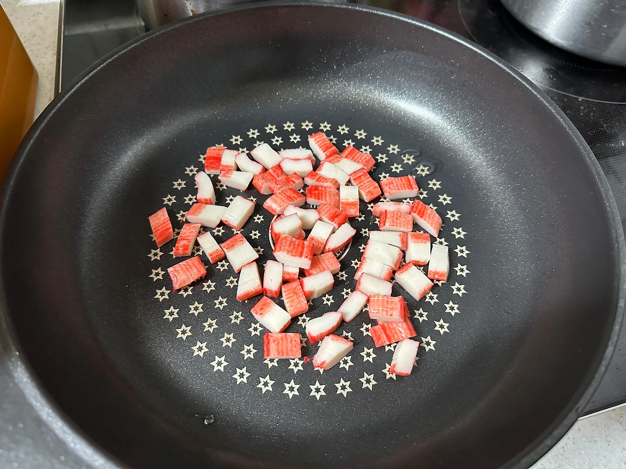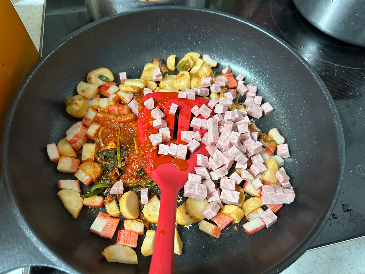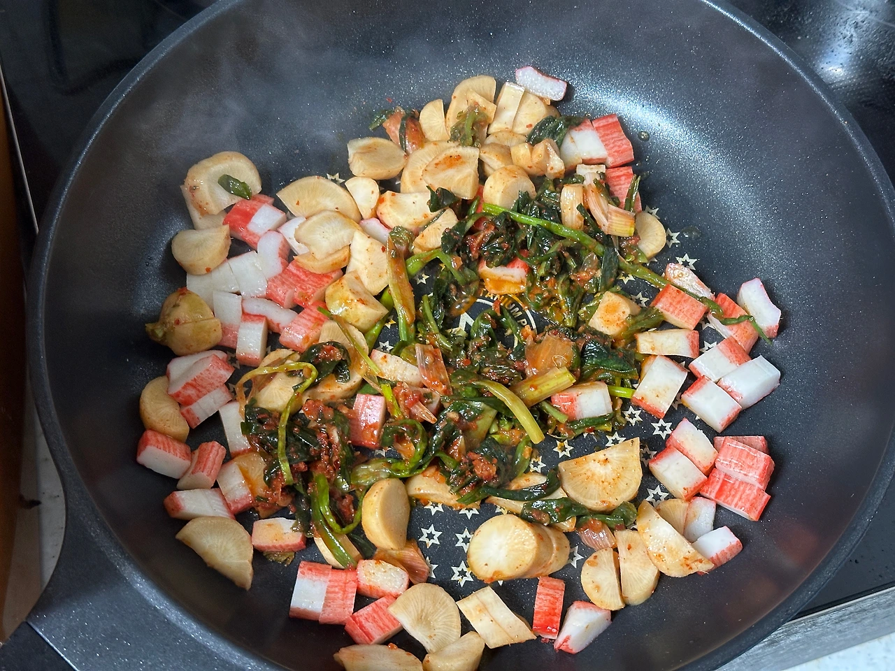 8살짜리도 만들던 요리다. 그냥 달콤매콤한 총각김치 하나면, 거기에 뭘 곁들여도 좋은 요리다. 맛살은 바깥양반의 취향이다. 유통기한 한달이 남아있던, 4~50줄 정도의 맛살을 사 다 먹어간다. 엄마는 이 총각김치에 쪽파도 넉넉히 넣으셨기 때문에 자극적인 향이 더욱 풍성히, 기름에 볶아져 나온다. 볶음밥에, 그래도 햄은 조금. 적당한 분량만 넣는다.