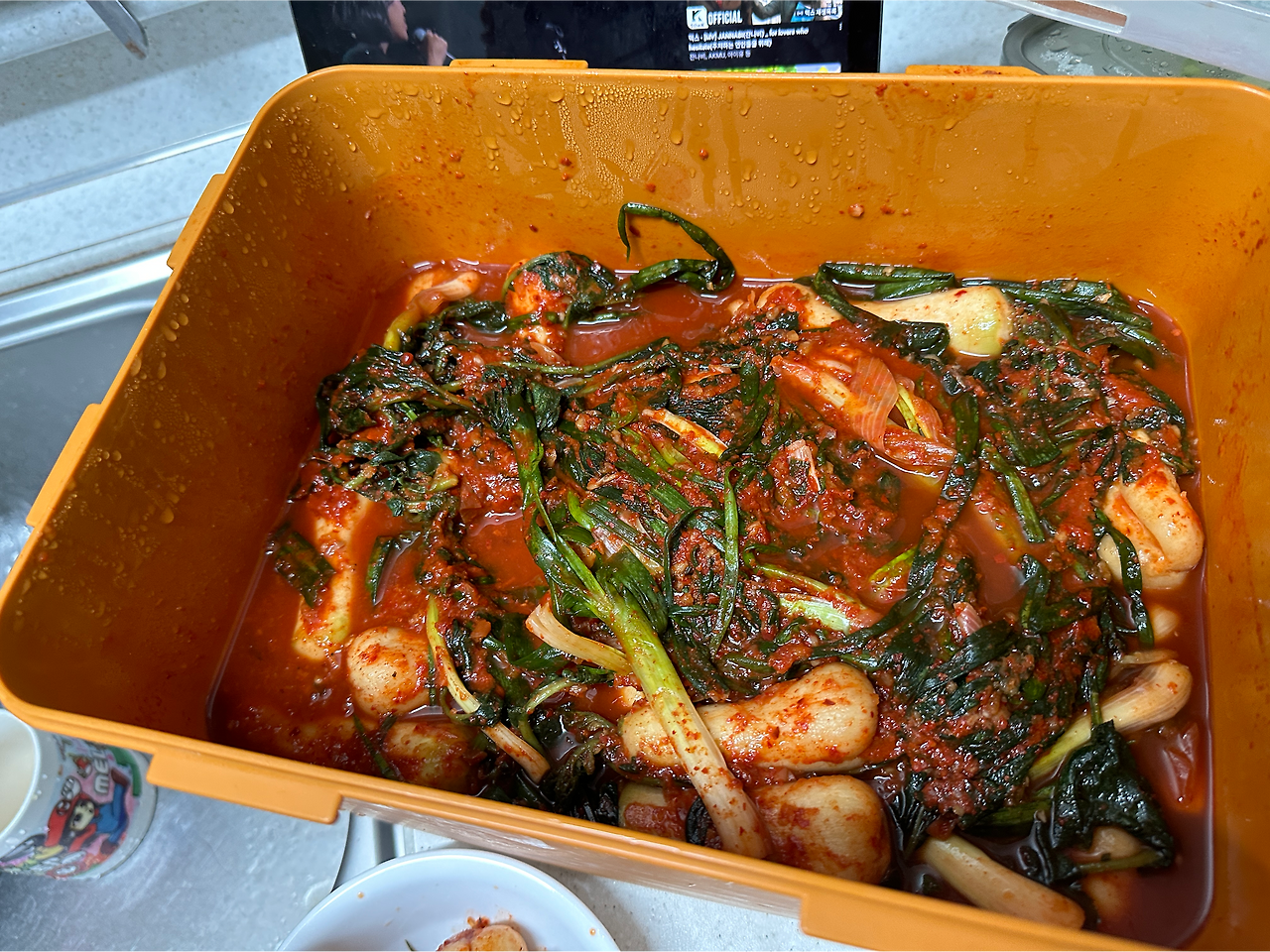 이야기는 조금 더 거슬러 올라가서, 2020년 쯤, 뜬금없이 바깥양반이 총각김치 5kg 정도를 택배로 시킨 일이 있다. 가뜩이나, 바깥양반의 시어머니께서 심심하면 온갖 김치를 만들어주시는 통에 김치를 소진하는 게 고민인 터라, 김치를 사먹는다는 상식 자체를 받아들이지 못하는 터에 나는, 바깥양반이 친 사고에 조금 짜증을 내었다. 아니, 총각김치가 먹고 싶으면 시어머니께 조금 부탁을 하면 기꺼이 만들어주실 것을. 한마디 말도 없이 시킬 것은 무어냐.