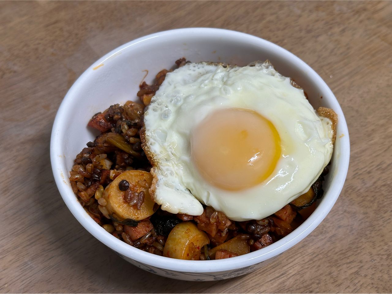 아침을 이렇게 새빨갛게 하면, 아이가 먹을 것이 없는데, 요즘은 애가 너무 잘 먹는다. 그래서 내가 밥을 차리는 동안 바깥양반은 바나나를 썰어서 일찍 잠이 깬 아이에게 건냈다. 나는, 뒤에서 계속 밥상이 언제 차려지나 힐끗거리는 바깥양반을 신경쓰며, 밥을 후루룩 볶아낸 뒤 그 팬 위에 그대로 계란 프라이를 올리고, 뚜껑울 덮었다. 총각김치 볶음밥은, 너무나 쉽게 완성된다.