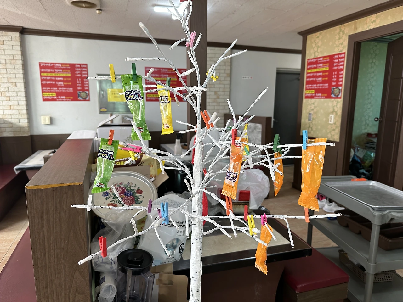 아이를 안고 신발을 신고 나오는데, 사장님께서 불쑥 비누방울놀이 장난감을 선물이라 주셨다. 놀이공간 가면 3,4천원씩 받고 파는 것을. 놀라며 아이에게 인사를 시키는데, 인사를 거부하는 아에에게 사장님은 웃으며 나무에 매달려있던 사탕을 따서 주신다. 마침 홀에서는 점심장사가 거의 끝나갈 무렵이었다. 점심 시간을 다 넘겨 온 손님에게 이런 환대라니. 이 맛에, 쓸데없이 고퀄인 잡채 위 계란 지단 고명에, 충분히 감사했는데.