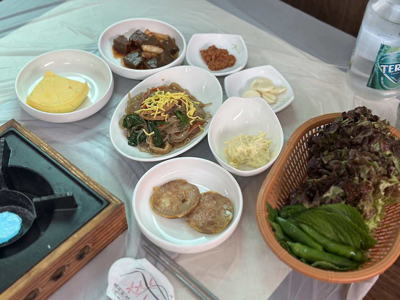 정갈한 상차림에 맛깔난 반찬들이다. 맛있다. 잡채는 내가 먹어본 어지간한 한정식 식당에서 나오는 것보다 맛있었다. 계란지단은 대체 왜 고생해서 만들어 올렸담. 그래봐야 만2천원 정식에 낀 구색인데, 왜 이렇게 열심히 오뎅까지 따로 양념을 해서 볶아 잡채에 넣으셨을까. 사람 고기 나오기도 전에 배불러지게시리. 게다가 섬초는, 지금이 섬초 먹을 철이라곤 하지만, 이렇게 달고 단 나물이라니. 야 지금이 정말, 섬초 맛있을 때다. 그 맛있는 섬초를 맛있게 무쳤다.