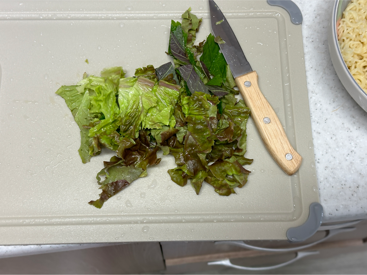 마트에서 재고처리 할인할 때 사 온 2천여원어치의 쌈채소, 중에 약간을 꺼낸다. 통영에 있는 동안 한번은 회를 포장해와서 먹을 생각이다. 그리고 통에 남은 김치 쫑쫑. 이게 다다. 둘이서 노나 먹을 겨우 이정도 채소를 먹이기 위해 나는, 바깥양반에게 비빔면을 해주려는 것이다.