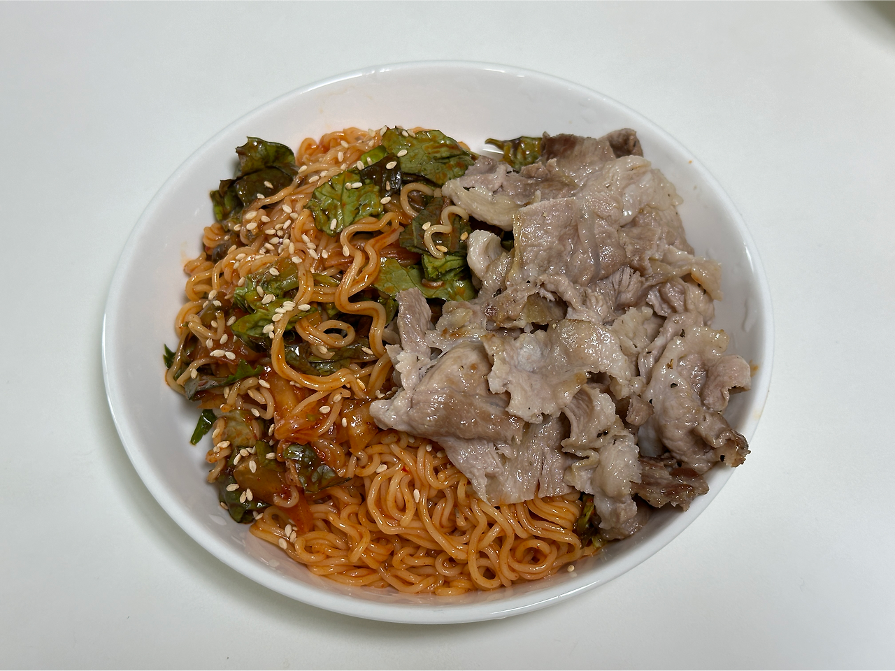 ...라기엔 일단 고기를 굽고 있습니다만. 이 시점에서 나는 우선 면을 끓여서 물을 빼낸 뒤 잠시 냉장고에 보관중이다. 고기 굽는 동안 냉장고 정도는 잠깐 괜찮잖아. 어제 마트에서 비빔면을 사오는 길에 앞다리살을 딱 4천원어치 샀다. 그래서 절반인 2천원 정도 치를 굽는다. 목적은 채소를 먹이자는 거지 대강 먹자는 것이 아니다. 2천원만 투자해도, 라면이 아니라 요리가 된다. 그런 철학을 나는 아내 아니 바깥양반에게 보이고 싶다.
