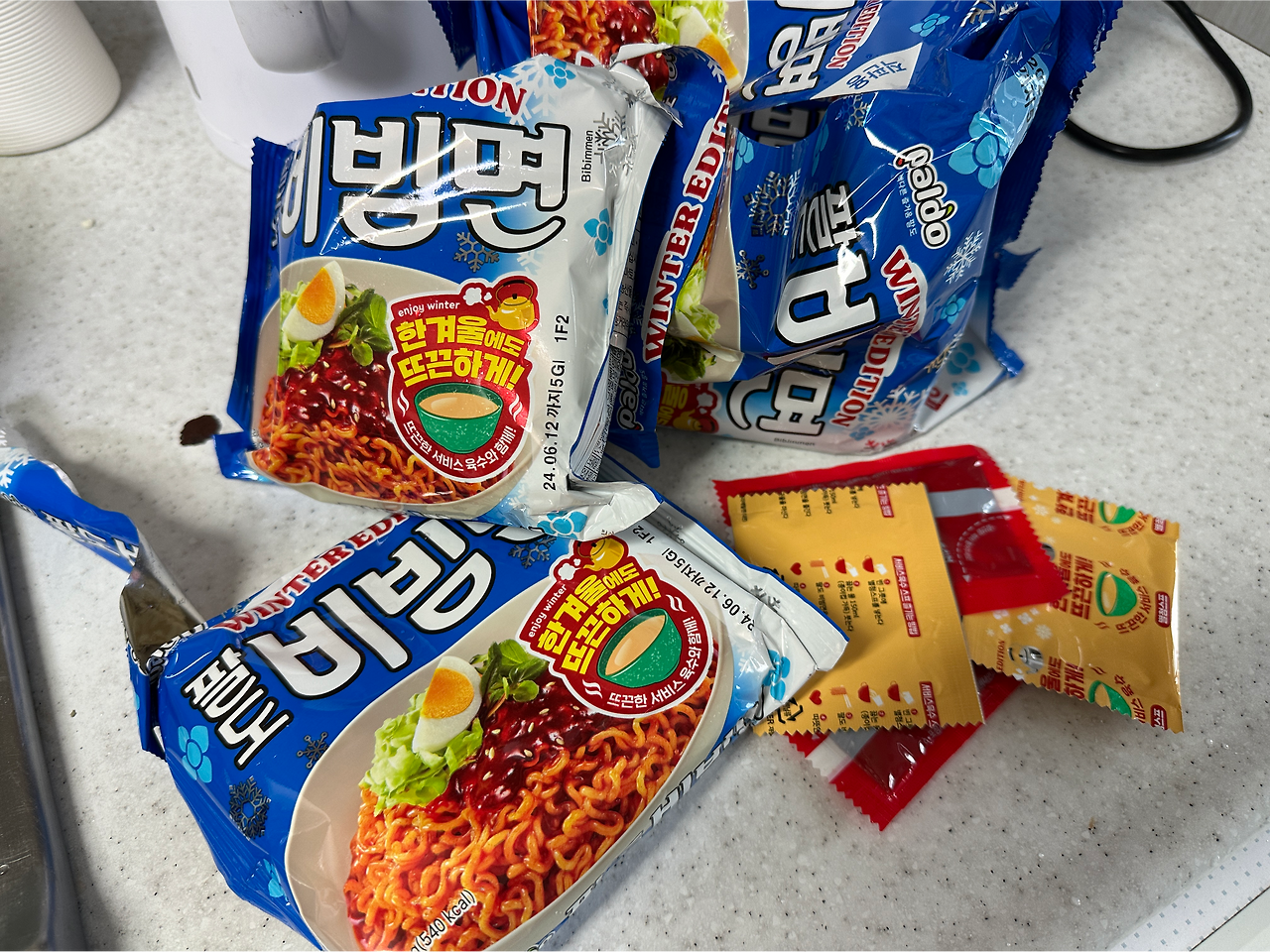 나 답지 않게 깨소금까지 뿌려주었다. 깨소금은, 굴에 찍어먹을 기름장을 만들기 위해 샀다. 그렇다. 포기할 수 없는 생굴의 그 맛의 핵심요소 중의 하나였던 것이다. 소금에, 깨소금에, 챔기름. 참기름도 여기 와서 샀다. 아 참기름도 넣었네. 그래 정성 가득 비빔면이구나 참말로 그러고보니.