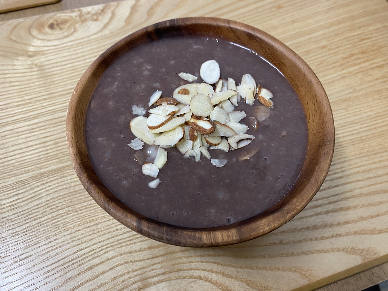 뭉근히 데워지는 팥죽의 빛깔이 좋다. 향은 더욱 좋다. 한 입 먹어보니 단맛이 약간 부족한가 싶다. 설탕을 반스푼. 다시 두바퀴 휘 휘 저은 뒤 맛을 본다. 딱 좋다! 그릇에 옮겨담은 뒤 아몬드 토핑을 올리고, 자고 있는 바깥양반을 깨워 식탁에 앉혔다.
