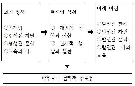 이 표는 우리의 자녀교육 성찰과 협력적 주도성의 관계를 설명하고 있는 도식입니다. 과거에 대한 성찰, 현재의 실천, 미래의 비전을 하나로 통합되어 협력적 주도성을 형성합니다.