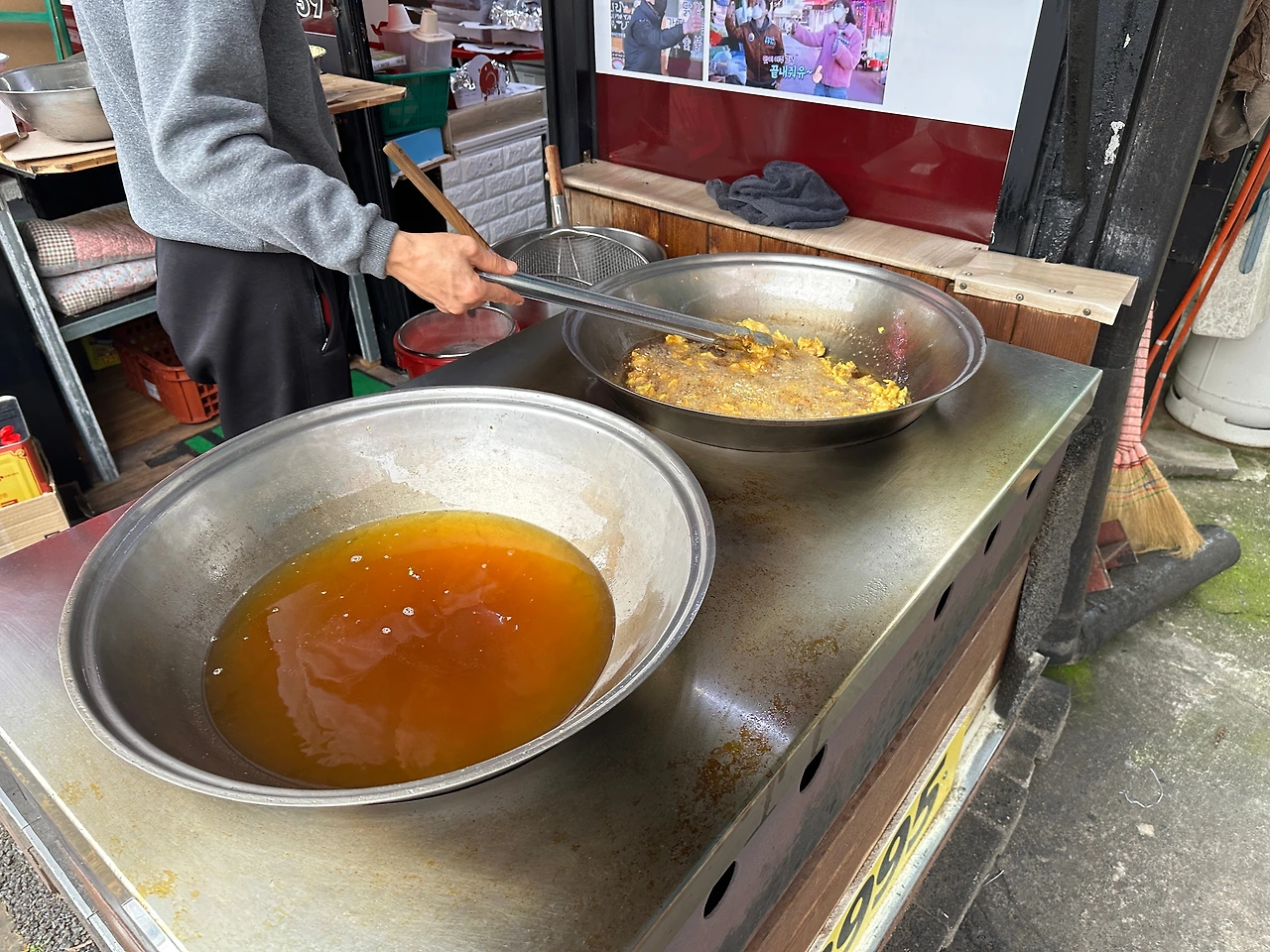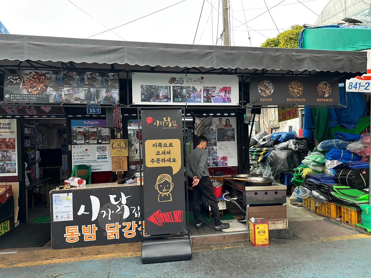 이것저것 방송 출연 경력이 붙어있는, 전형적인 관광지풍의 입구 옆에선 남자 사장님께서 열심히 닭을 튀기는 중이시다. 닭 색이 꽤나 밝다. 그리고 가마솥을 이렇게 꺼내서 기름 때깔을 보여주시니 이거...매력적이야. 공주산성시장에 있는 닭강정집도 이렇게 밖에 놓고 닭을 튀기시는데, 이게 좀 오래된 닭가게들이 이런 식이긴 하다. 앞에 닭을 늘어놓고, 그 옆에 튀김기를 놓고 팔던 식.