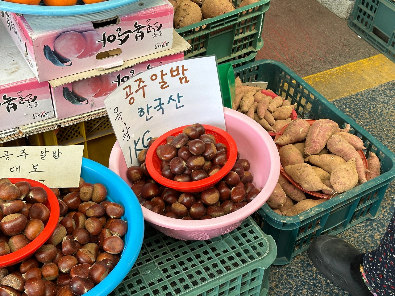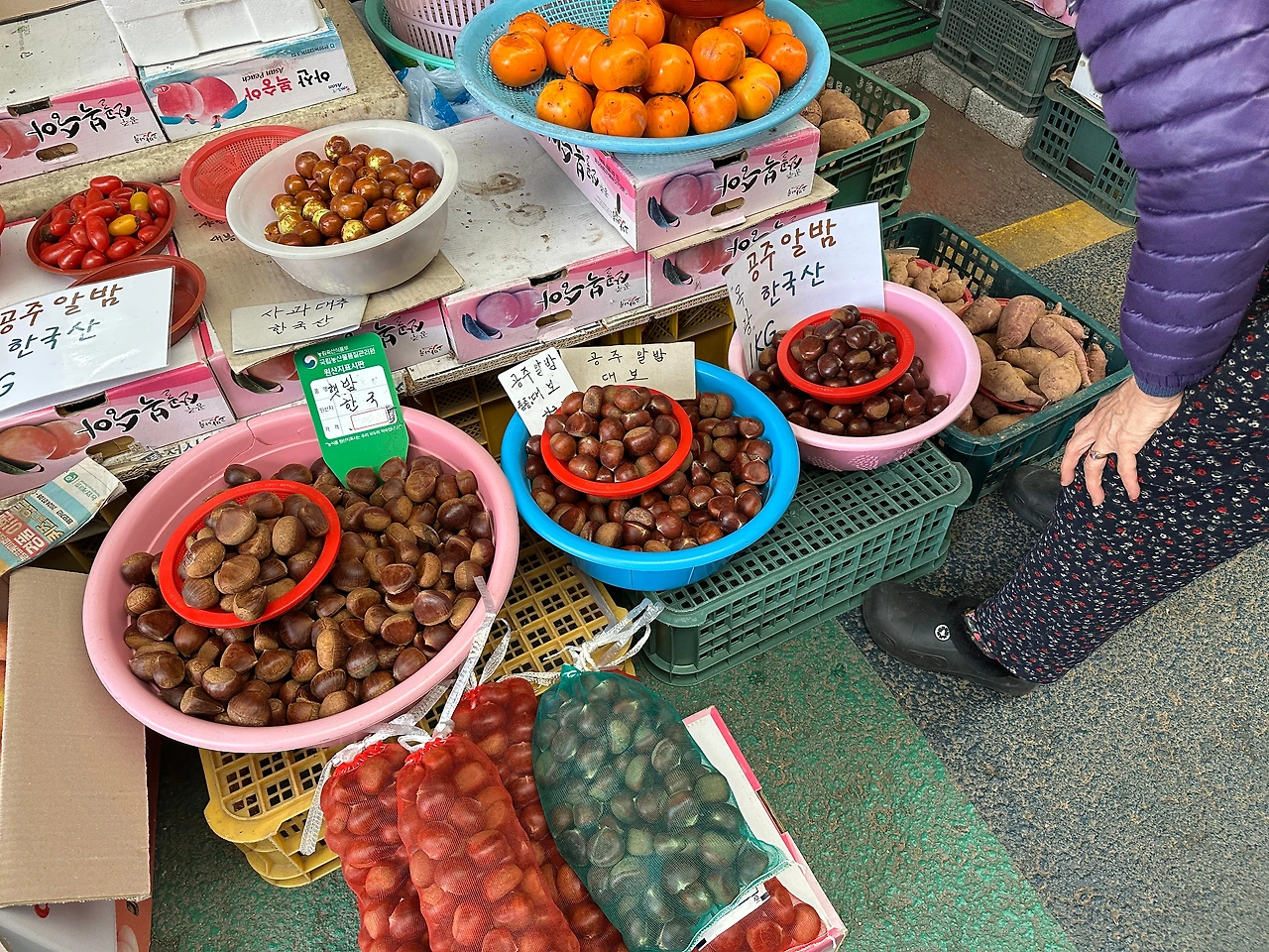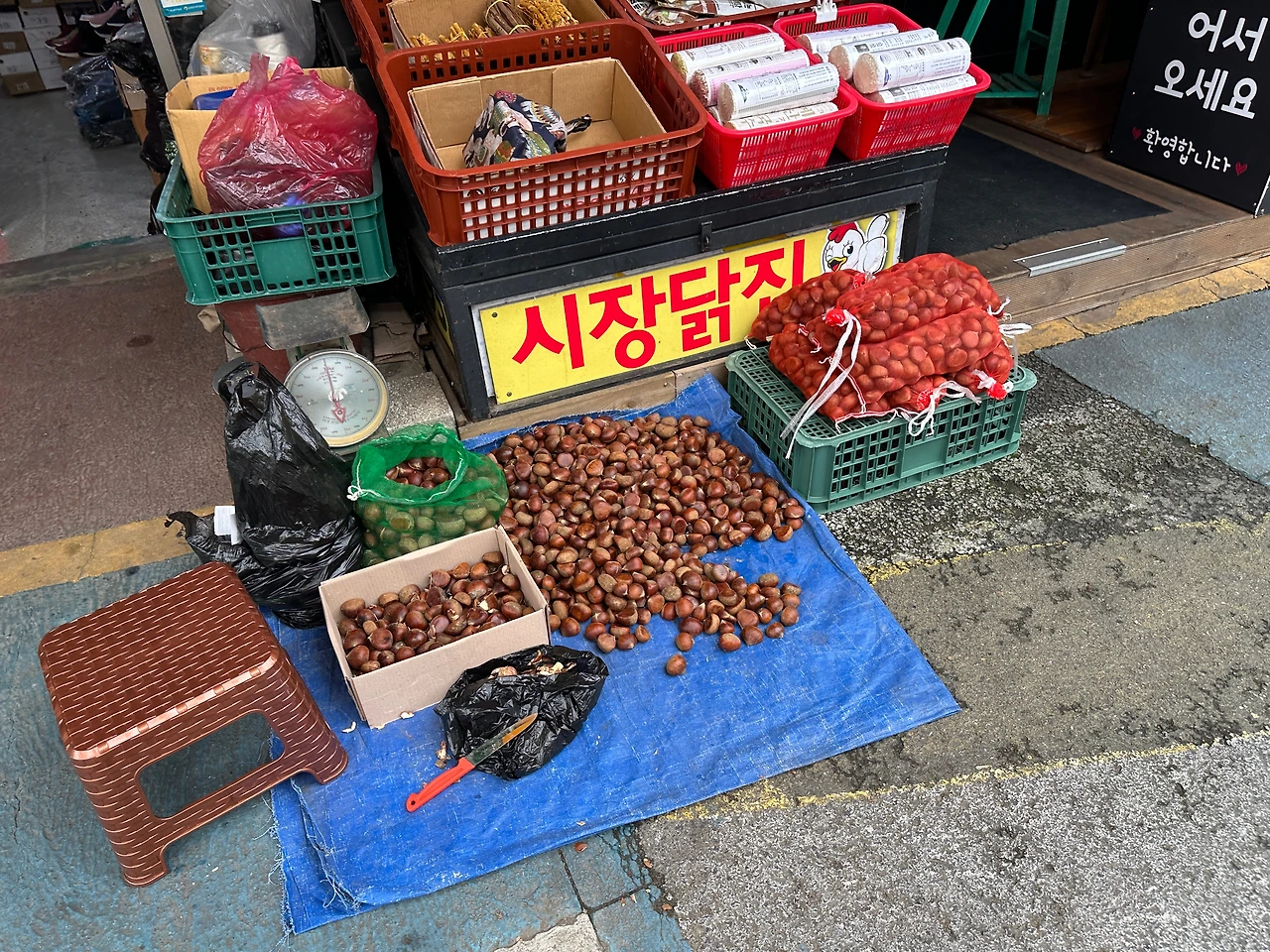 닭집이라시더니 공주 특산물 밤을 살려 밤을 올린 닭강정을 하는 곳이다. 그래서 가게 입구에 그렇게 밤이 몇포대나 쌓여있고, 장사 중 짬깜이 밤을 깐 흔적이 보인다. 이거 밤 깍는게 사람 잡는 일인데 기계라도 쓰지 않으시고. 하기사. 기계로 깎으면 제대로 속껍질이 깎이지 않으니 그것도 골치다. 밤 무더기 위로는 여름에 많이 나갈법한 황기 등의 한약재와, 삼계탕에 잘 어울릴 국수 하나. 예산이 가까우니 거기서 국수도 좀 얻어다 오시려나.