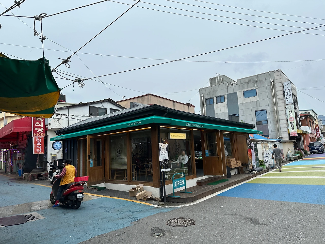 내가 시장 뒤 주차장에 차를 댔으니, 이쪽이 입구일 텐데, 야 깔끔하고 멋들어진 카페다. 여기에 나이 지긋한 할머니들과 젊은 손님들이 섞여있다. 그-러니까, 내, 착각이었구나. 한적한 시장 뒷골목을 보고서는. 쓸쓸한 정취에 혼자. 사실은 작다란 읍내에 학교만 네개가 있는, 나름 이 근처, 중심지인데. 그런데 그게 참 요상하다. 진짜로 위로도 산. 아래로도 산. 이쪽도 산 저쪽도 산인 좁디 좁은 고장에 고속도로 IC가 하나 붙어있다.