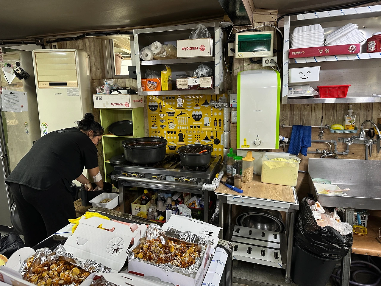 가게 안으로 슥 들어가서 여자 사장님 두분께 말을 건다. 뜻밖에도 조리해서 김을 빼고 있는 닭강정이 너댓박스나 있나. 핫플이라고 할만하구나.