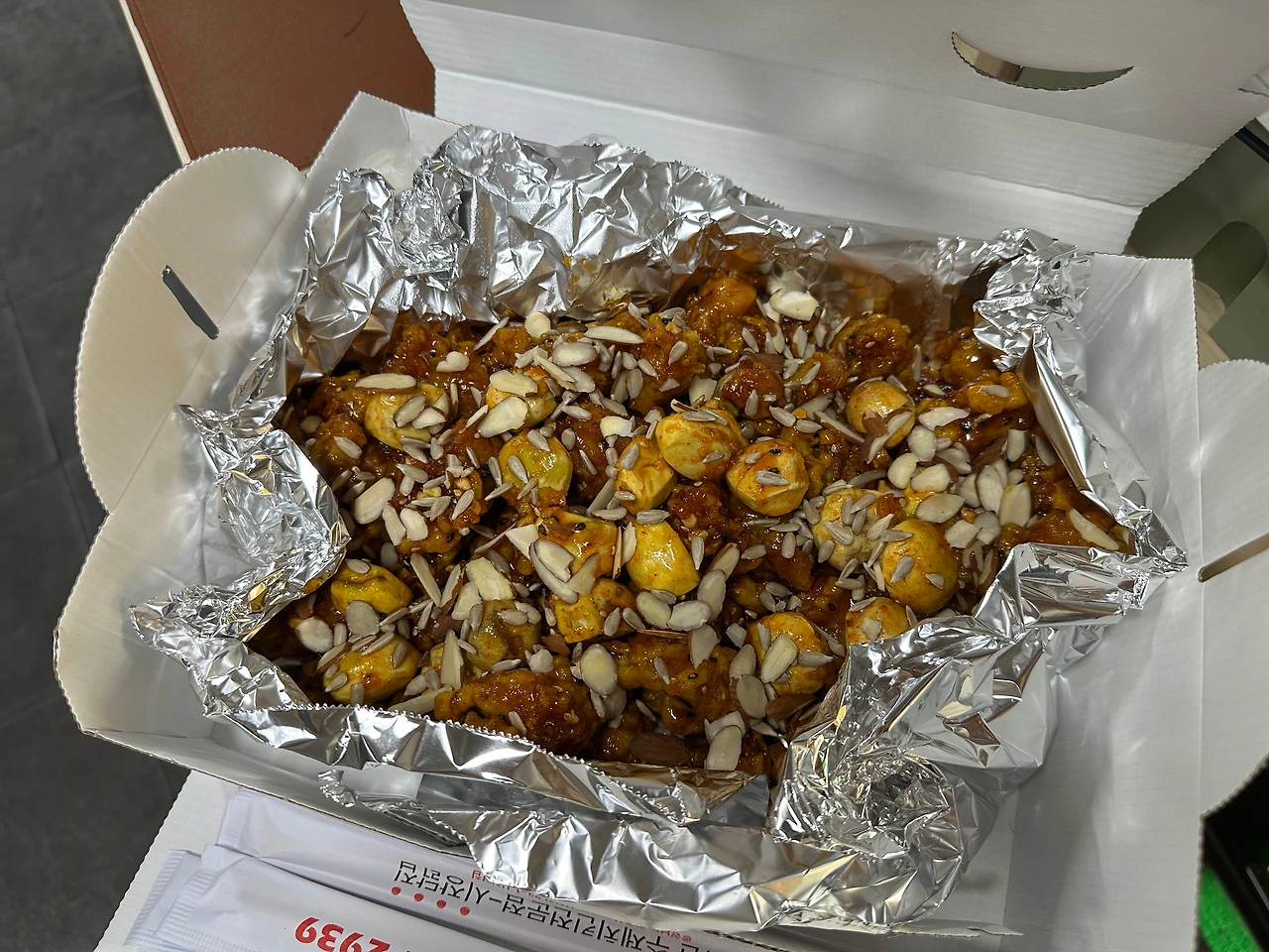 장사 경력을 알만하다. 우리가 딱 20분 전에 앱으로 주문을 했는데, 주문을 받아서 가져가는 시간들을 가늠하시곤 딱 맞게 우리 걸 다른 주문 사이에 빼놓으셨다. 그 덕분에 오자마자 그 즉시 따끈따끈한 닭강정을 받아볼 수 있게 되었다.