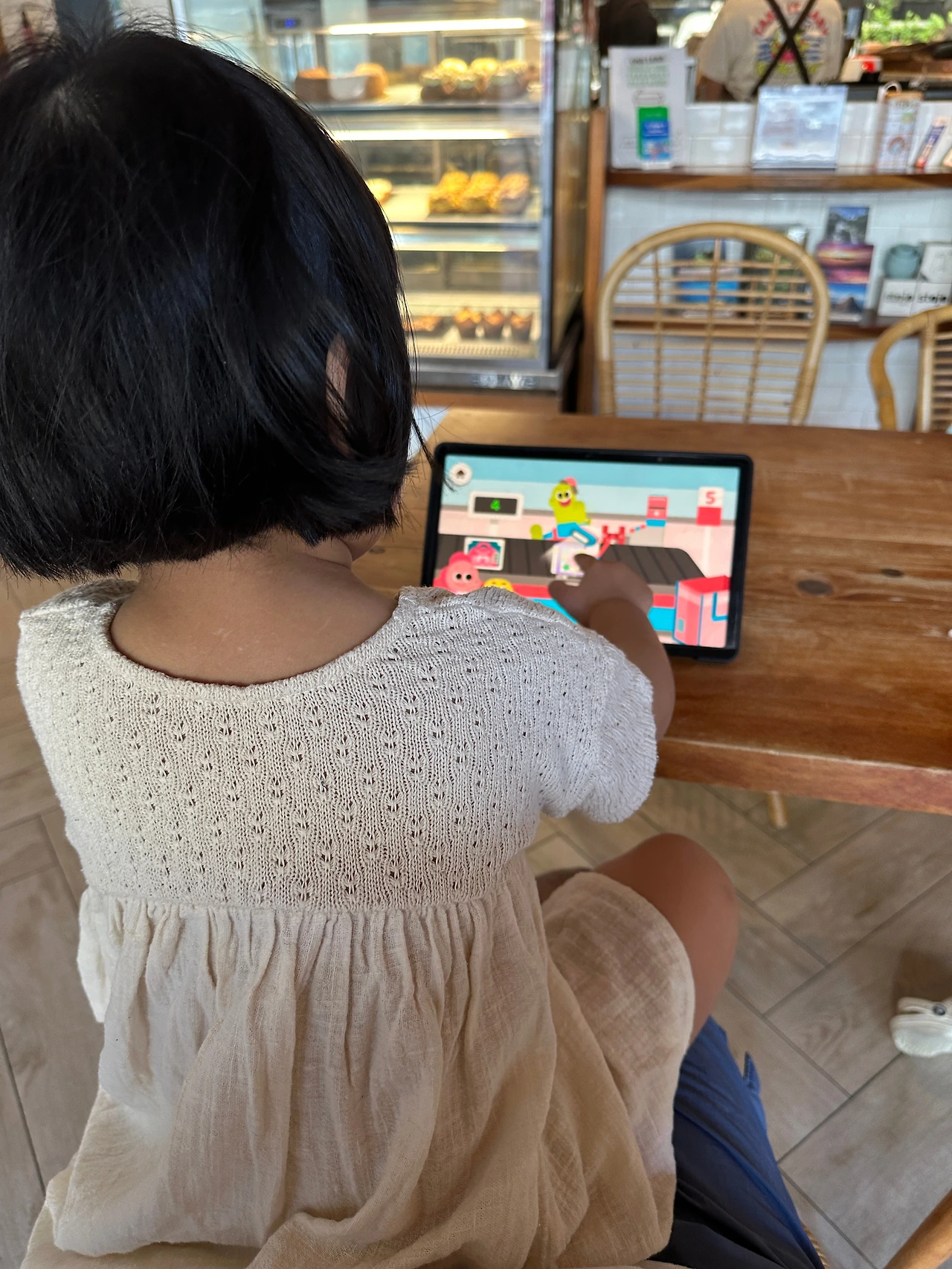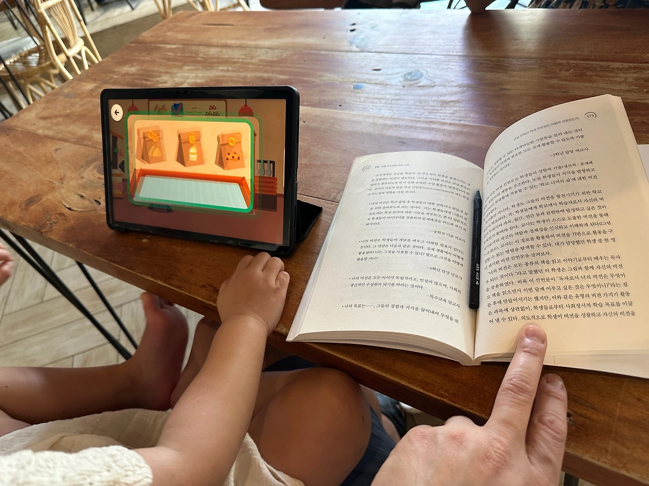 아기의자와 비슷한 순위로 아빠 무릎에 앉겠다고 한다. 아기의자가 있을 경우에는 확률은 반반, 아기의자가 없으면 무조건 아빠 무릎에 와 앉는다. 특히 카페에 오면 제 엄마는 거의 관심도 없고 아빠 무릎에 앉아 태블릿으로 게임을 하거나 영상을 본다. 이것이 아내가 좋아하는 카페 나들이에 있어서 나의 크나큰 고뇌다. 카페란 기호이고, 필수적인 생활의 요소는 아니다. 우리는 제빵소처럼 카페에서 밥을 해결하는 일도 거의 없다. 그저 아내가 카페를 좋아라 가는 것인데, 가면 카페에서 있는 내내 100센티가 넘어 이제 무겁기까지 한 아이를 몇십분이나 무릎에 앉히고 팔딱거리는 것을 견뎌주어야 한다. 이게 쉽지가 않다.