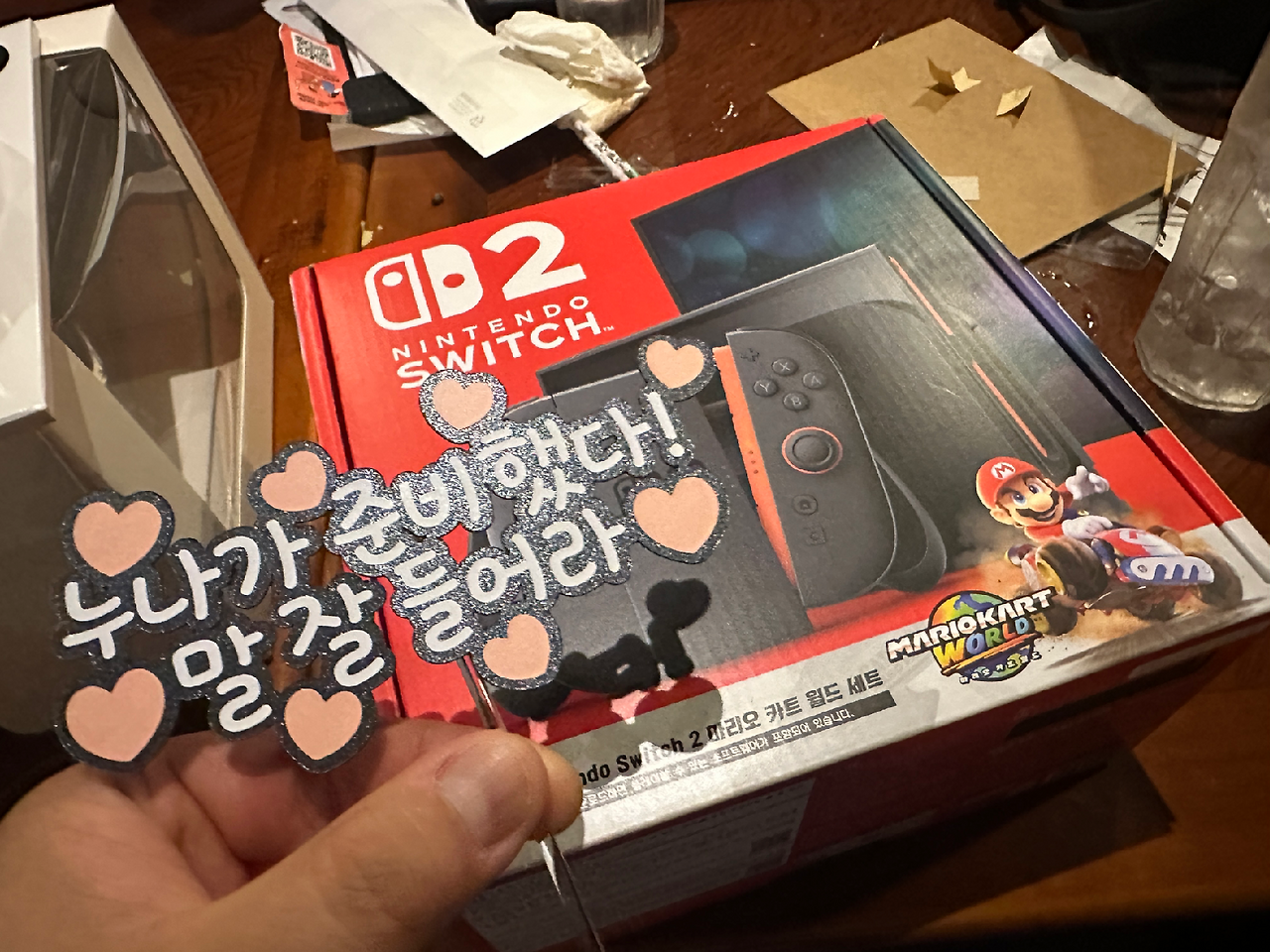 그...것은, 닌텐도 스위치2였다. 아니, 몇개월 전에 내가 그냥 농담으로 "이거 사주면 5년치로 칠게-."했던 물건. 지금으로부터 4년 전에는 플레이스테이션5를 받았었더랬지. 그래서 5년치 몰아주기 선물이면 되겠다며 농담으로 말을 했고, 심지어 한달 전에는, 이런 대화도 있었더랬다.