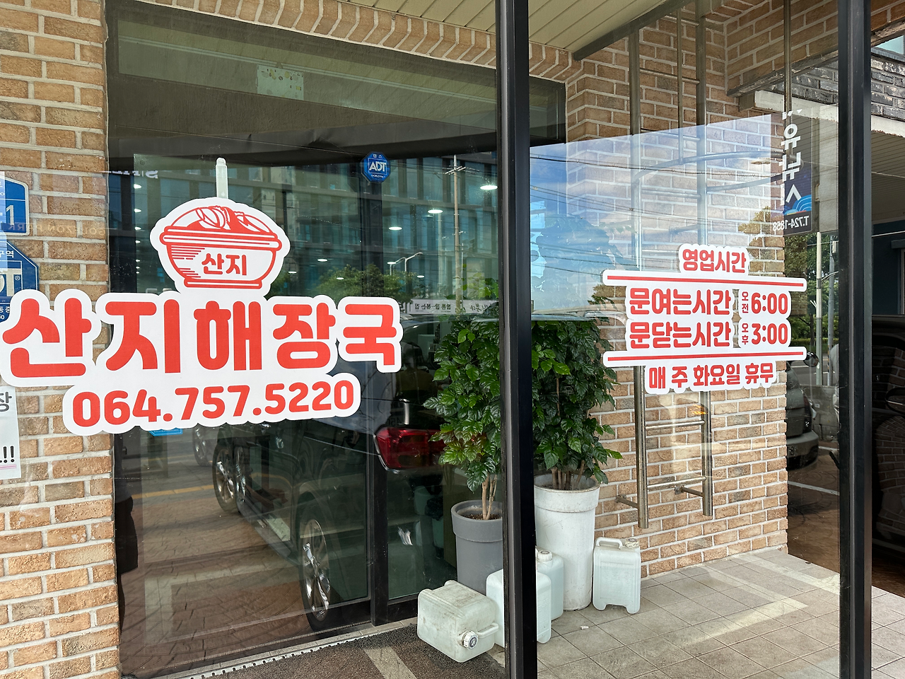 산지해장국은 원래 동문시장과 제주항 중간쯤에 있다. 구도심이다. 이름이 알려지지 않은 채로 장사를 잘 해오다가 몇해 사이에 알려졌다. 그래서 해장국집이 많고 많다는 제주에서 몇해만에 열 두 곳이나 체인점이 만들어졌다. 내가 찾은 곳은 우리 숙소가 위치한 삼양점인데, 본점도 가깝긴 하지만 그렇다고 왕복 7분 거리에 있는 식당을 냅두고 시내로 들어가는, 왕복 35분짜리 길로 만들 일은 아니다. 식당 별점 한번 슥 보고 출발. 식당엔 단숨에 도착했다.