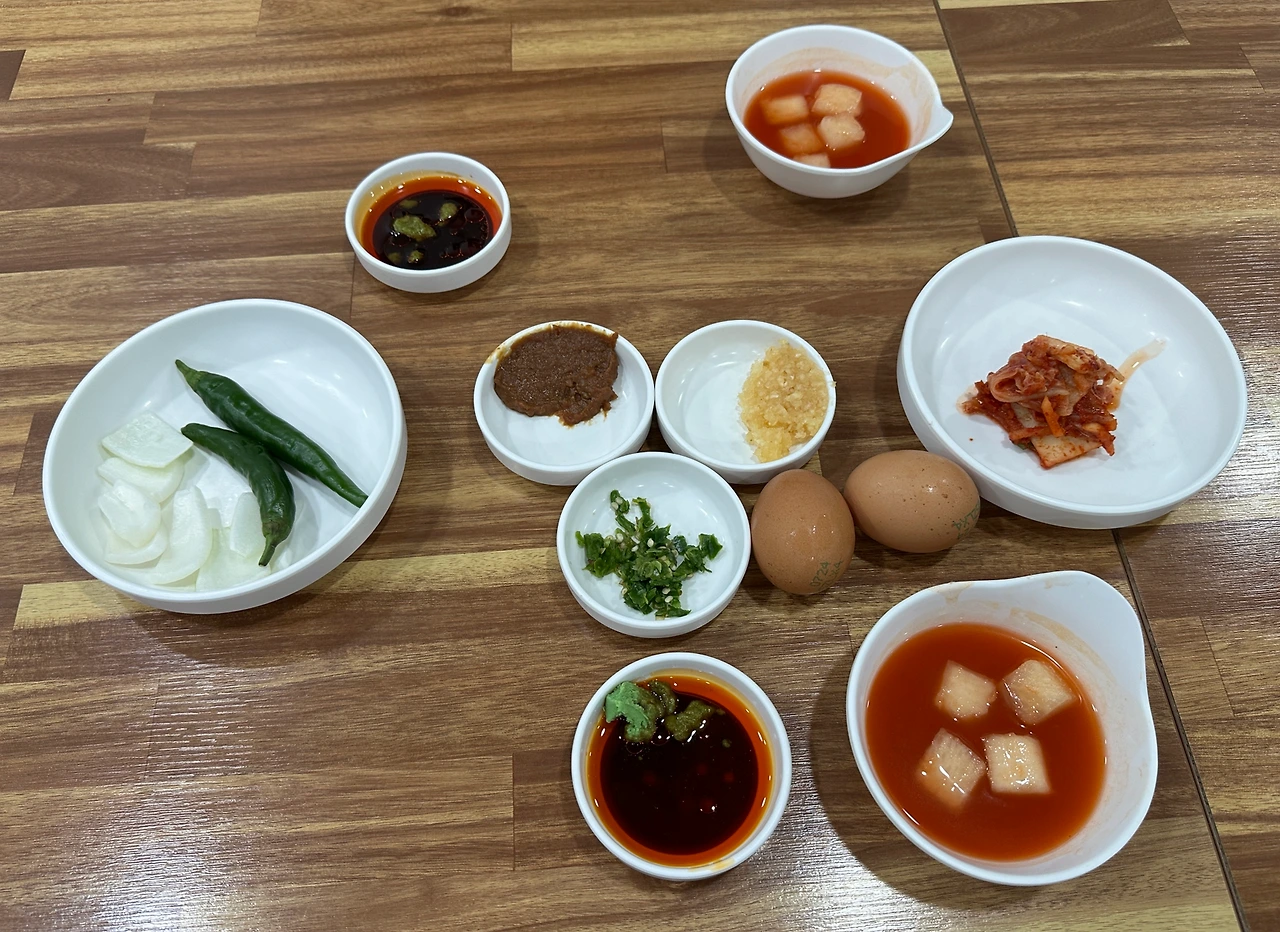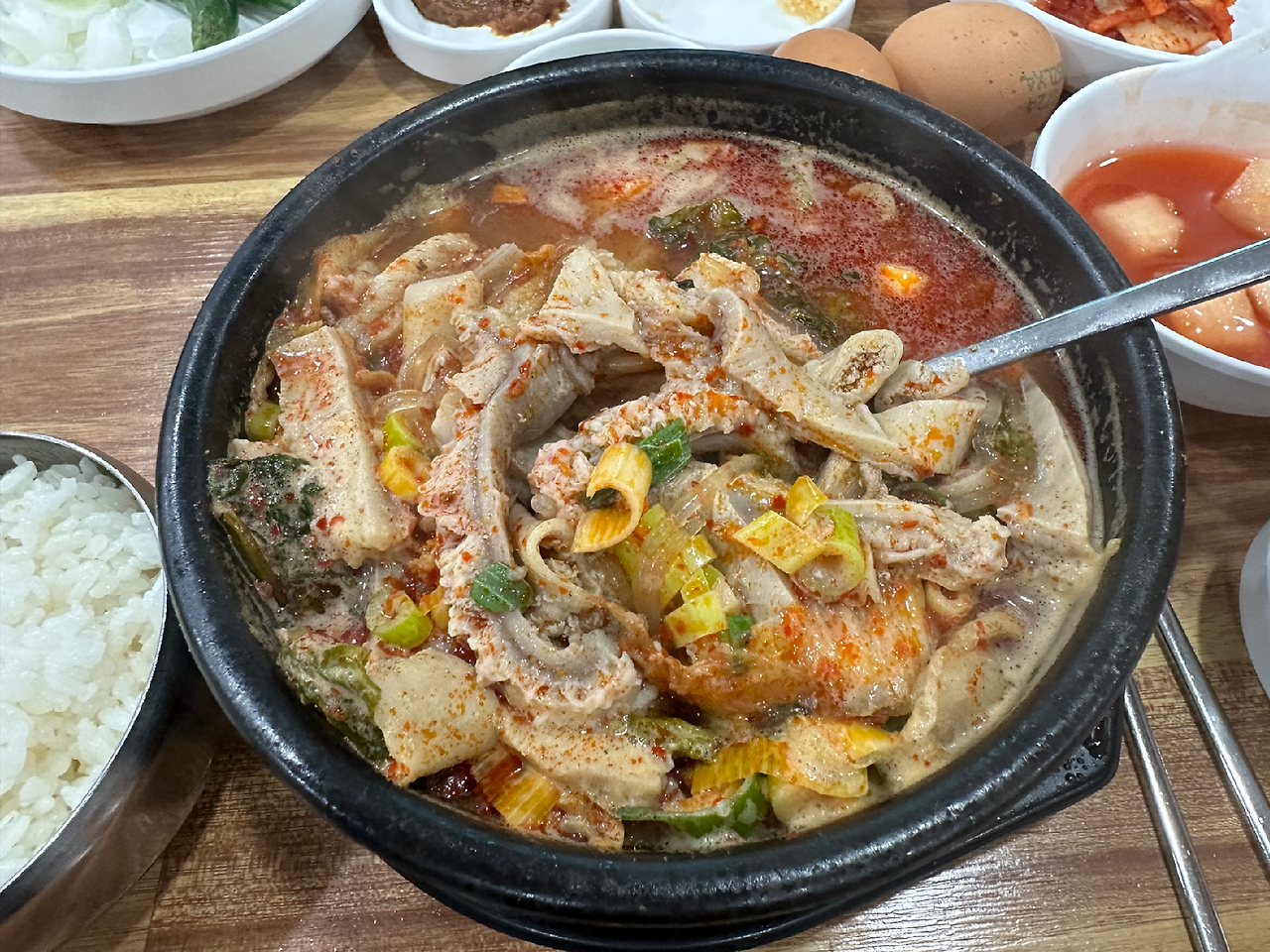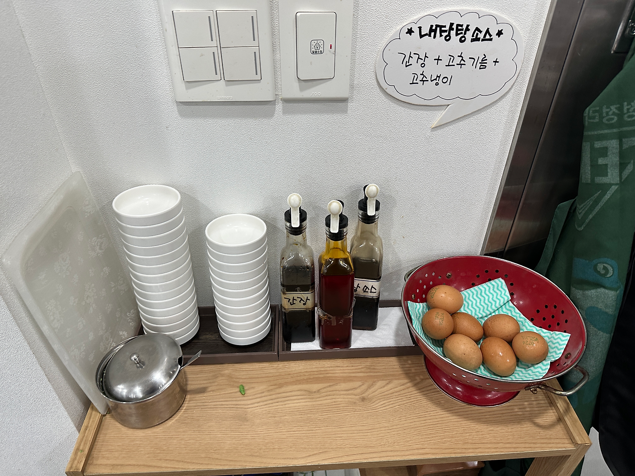 그 노동자 중심의 로컬 식당, 이라는 점은 계란 인심에서도 드러난다. 식당에 들어가 자리에 앉기전에 내장탕 소스 담아먹으라는 채비와 계란부터 눈에 들어온다. 두개를 집어 자리로 가져왔다. 먹을 것이 부족하던 시절엔 계란 하나 올려주고 말고가 인심과 정성에 있어서는 천양지차였다. 대접받는 감정은 계란 하나로. 나날이 노동에 지치고 살 일은 빠듯한 사람들에게, 여전히 고마운 물건이다. 처음에 탁 넣어서 먹어도 좋고 처음엔 깔끔한 국물로 몇술 먹다가 뒤에 넣어도 좋다.