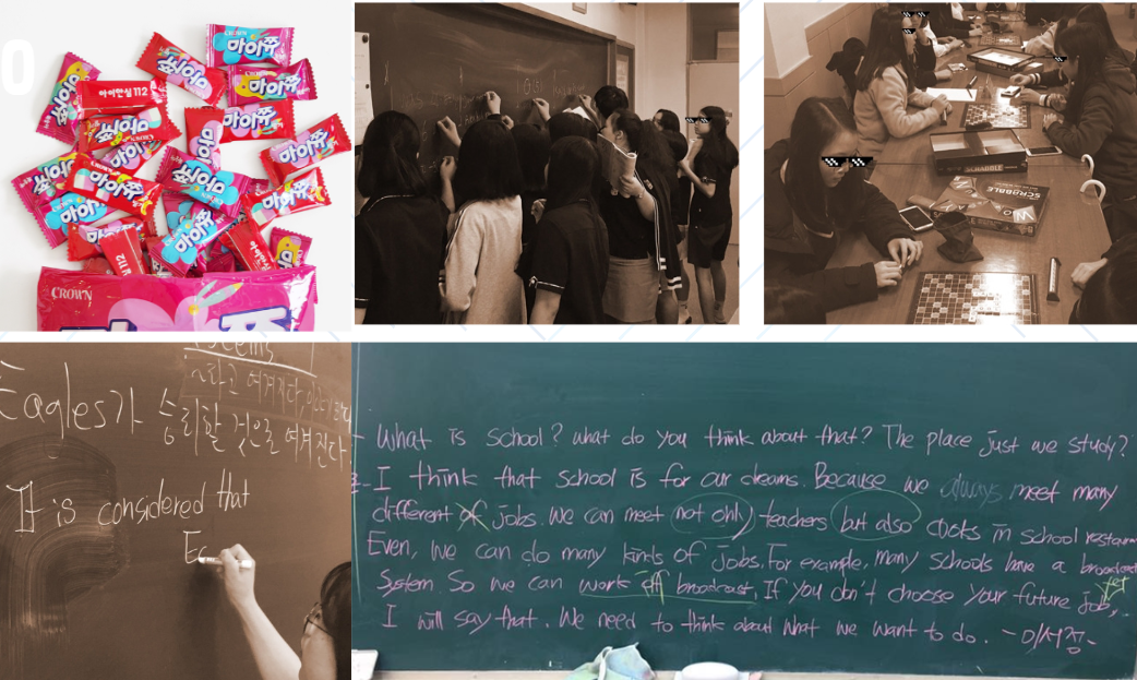 예를 들어 이제 중학생부터는 잘 많이 안 하는 실수이긴 한데 고등학교까지 와도 be동사를 무조건 문장에 집어넣는 아이들이 있어요. 진행형이 아님에도 불구하고. 그런데 그런 아이들이 칠판 앞으로 나와서 그 문장을 써줬을 때 제가 지적을 해주고 고쳐주고 이러한 과정들을 통해서 점차적으로 아이들이 모두가 책상에 다닥다닥 붙어 칠판에 붙어 가지고 즐겁게 영작을 하게 되거든요. 단어로 게임도 시켜주고, 2학기에 10월쯤 되었을 때는 1년 동안의 자율적인 영작이 무르익어서 거의 아이들이 한 반에 한 3분의 1에서 4분의 1 정도는 아이들이 생각한 것을 술술 쓸 수 있는 단계가 되었어요.