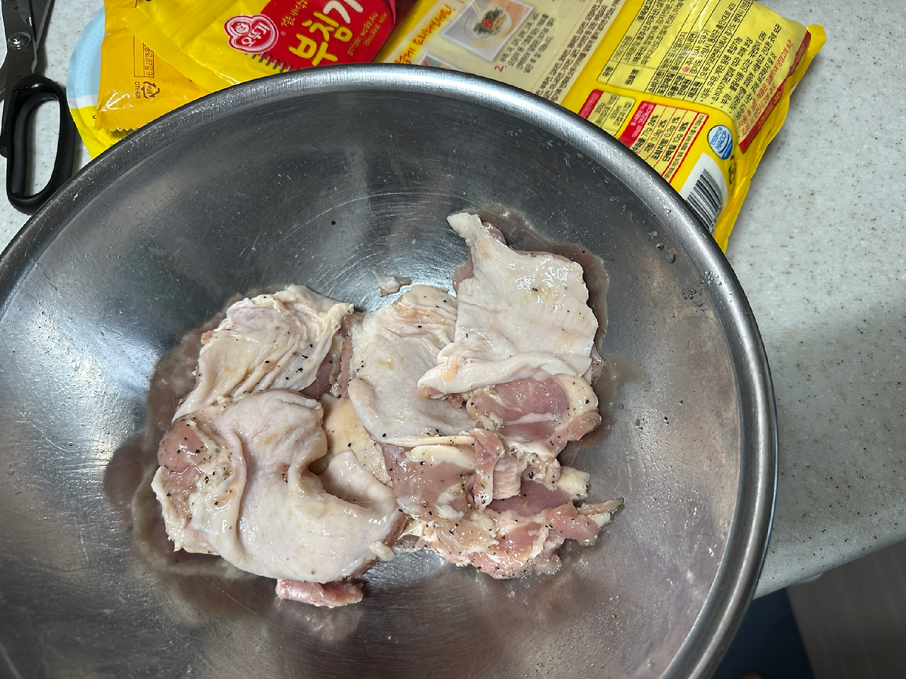 닭다리 정육을 꺼내 물로 씻은뒤, 키친타올에 물기를 빼고, 다시 맛술과 허브솔트로 버무린다. 치킨스테이크. 치킨스테이크는 나와 아내 모두 즐기는 요리다. 손도 많이 안가고, 맛있다. 일반 치킨보다 건강할 것이란 환상을 품은 채로, 심지어 나는 올리브유에 이것을 굽기 때문에, 겉바속촉한 닭고기를 즐길 수 있다.