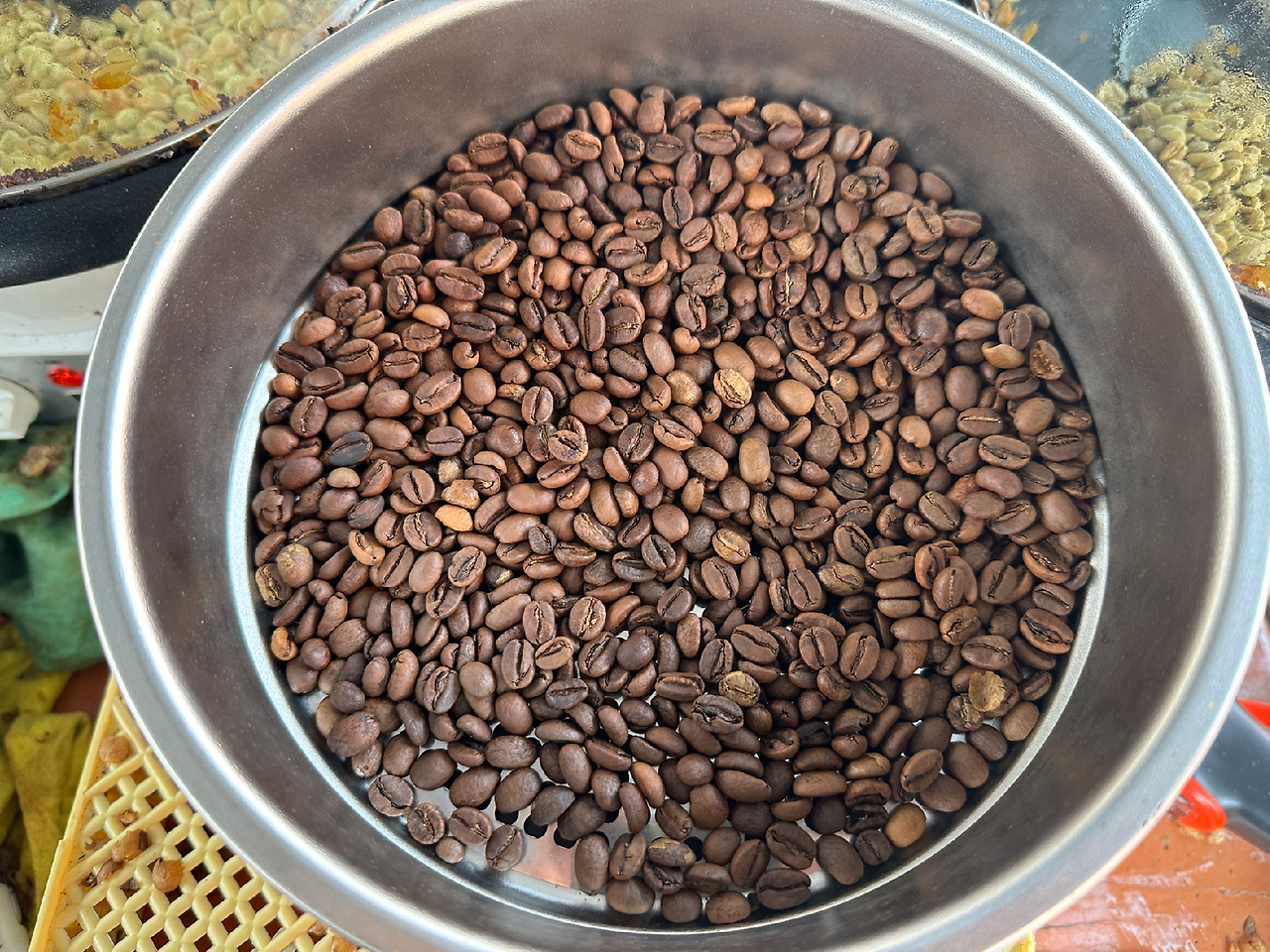 열한명이 나누어먹으려면 원두가 일주일에 1.5kg 정도는 필요합니다. 저는 1kg의 커피 생두를 17000원 정도에 삽니다. 로스팅을 마치면 15% 내외의 수분이 날아가기 때문에, 850g 정도가 됩니다. 그래서 한번 볶을 때 2kg를 볶게 됩니다. 이렇게 로스팅을 마친 콩은 원두가 됩니다.