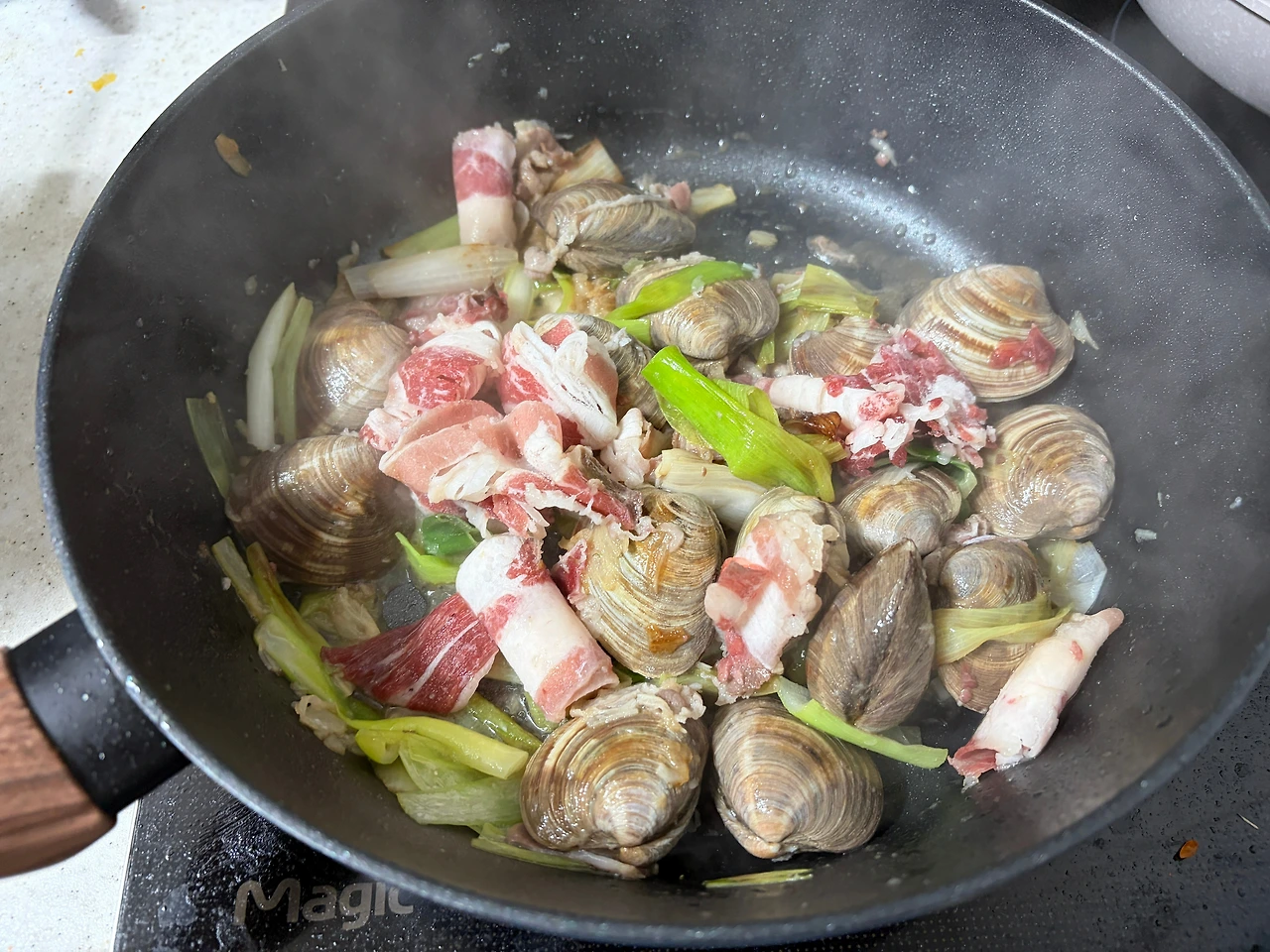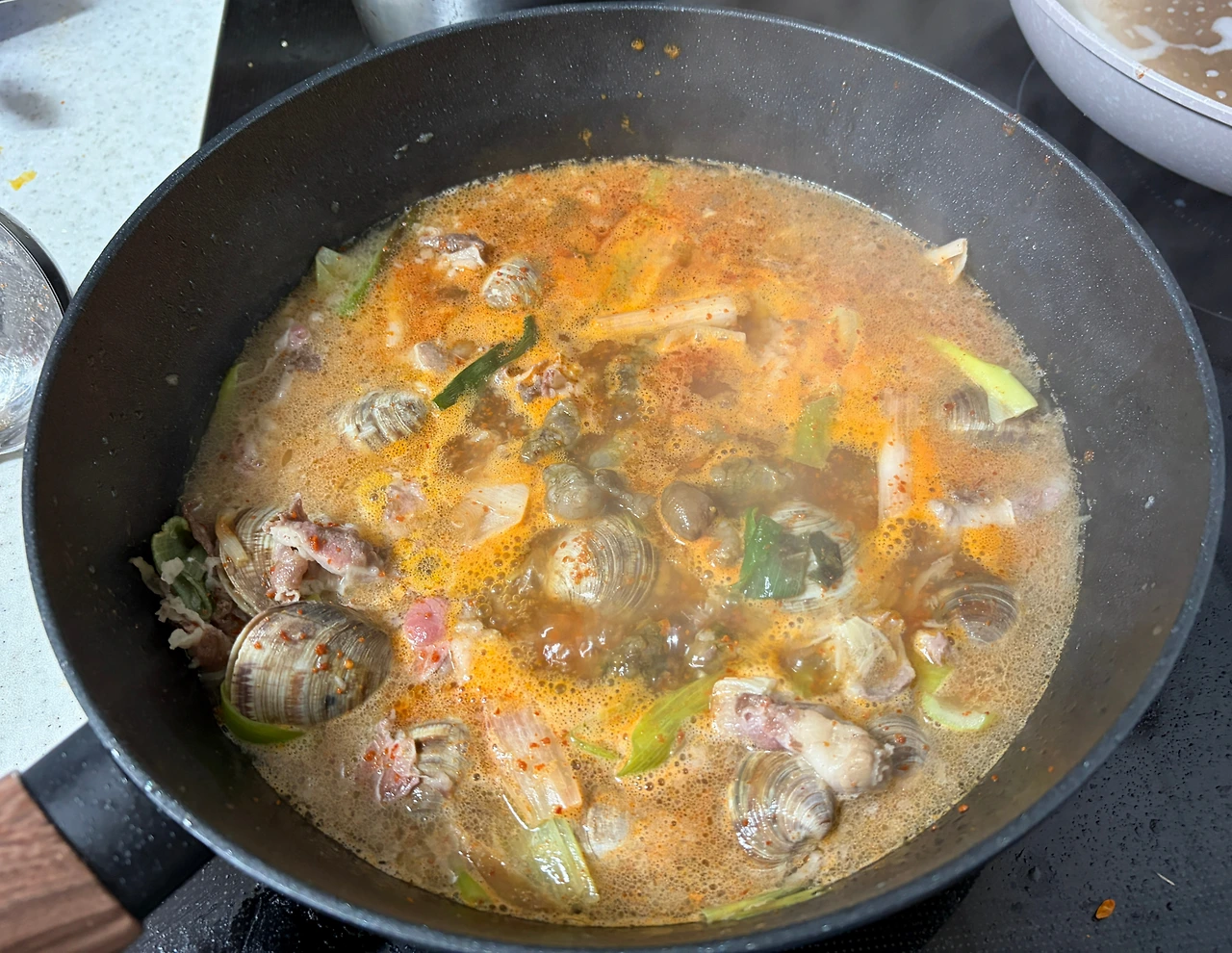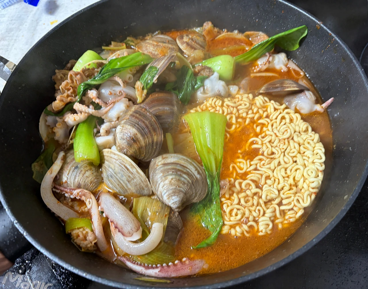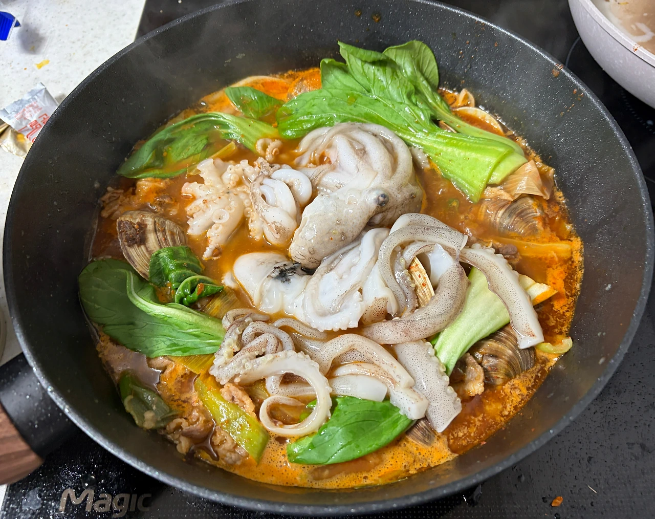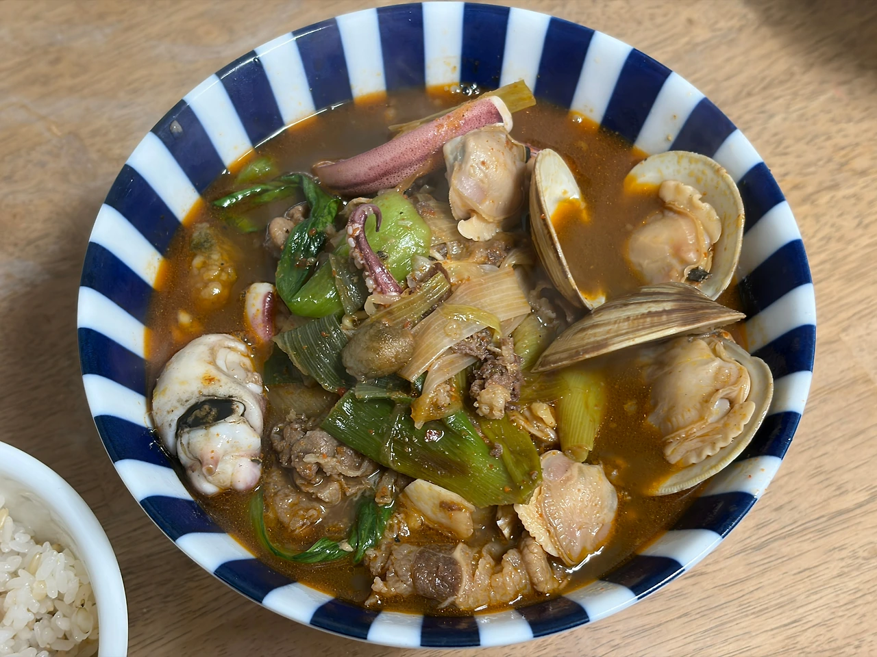 그리하여 집에 와서 동죽, 우삼겹과 대파로 먼저 기름과 육수 베이스를 내고, 고춧가루, 치킨스톡, 미원, 다시다로 국물을 만든 뒤 마지막으로 오징어짬뽕까지 투하. 나는 짬뽕탕을 만들어 밥을 먹을 생각이었는데 바깥양반은 라면 면발을 먹고 싶다고 한다. 뭐, 좋은 일이지. 그리하여 바깥양반게는 짬뽕라면. 나는 짬뽕밥으로 저녁식사.