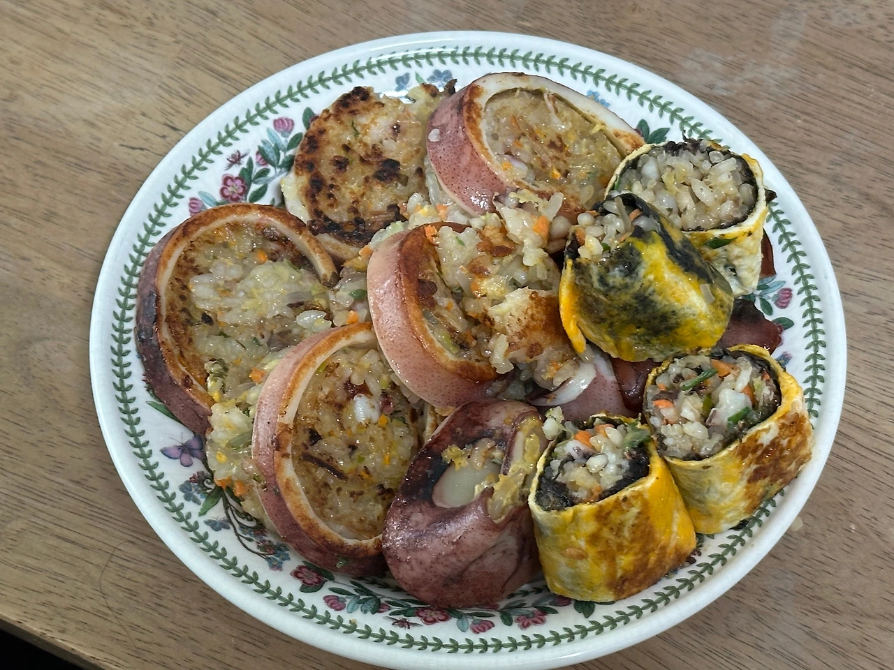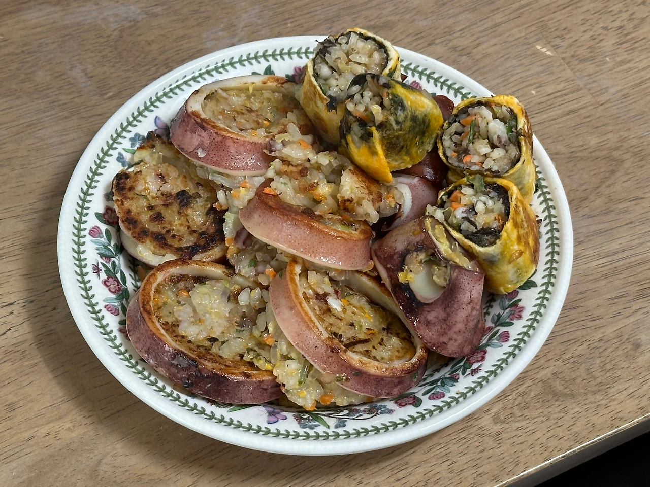 바깥양반은 누룽지 오징어순대에 아주 환장한 사람인데, 일요일에는 근처 아파트에 야시장이 열렸다기에 가서는 누룽지 오징어순대를 사달라고 조르기도 했다. 오징어순대 한마리에 15000원. 아휴야. 오징어가 금값이니 어쩔 수 없다지만. 그래 만원에 두마리를 사와서 찹쌀을 불림과 함께 볶아서 빨리 익혀내고, 당면, 당근, 양파, 대파, 다진 오징어다리로 빠르게 속을 채웠다.