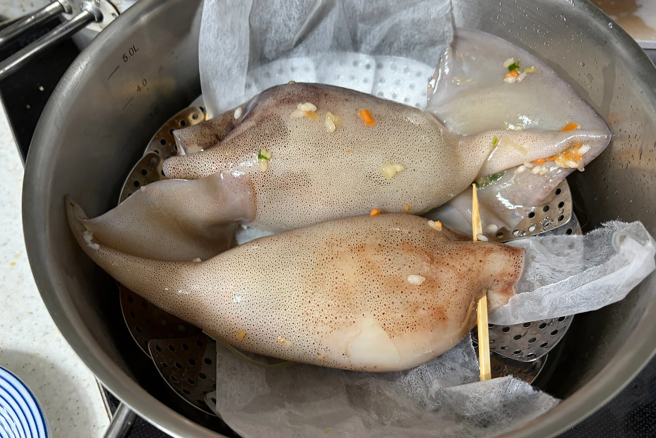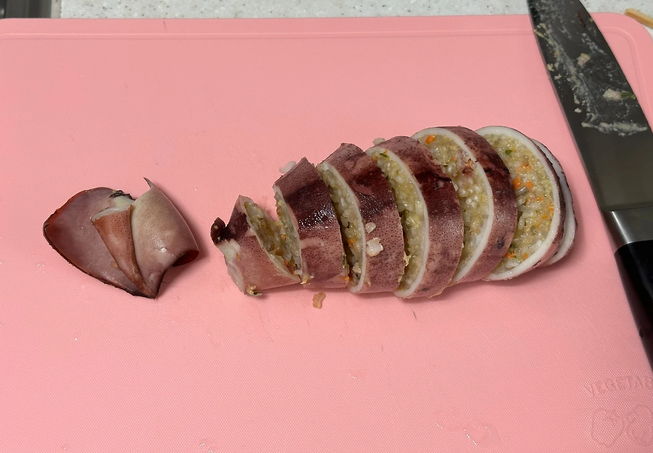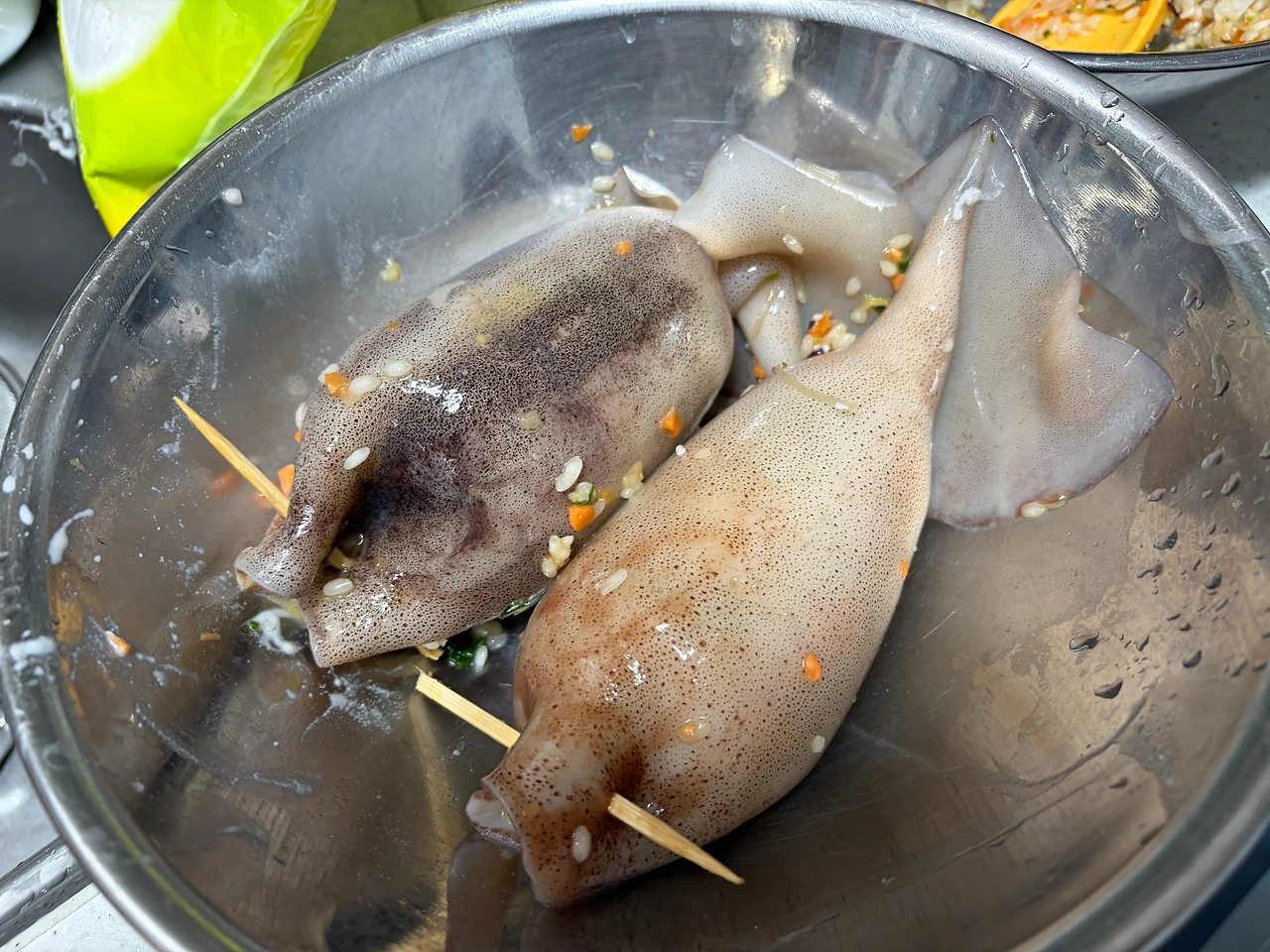 그리고 본론. 오징어 두마리를 사, 한쪽 다리만 샀다. 어물가게에서 "잘라드릴까요" 묻길래 "오징어 순대 만들건데 속만 따주세요"했더니 아주 나이스하게 오징어를 손질하고 뼈까지 빼주셨다. 쭈꾸미...로 날 화나게 하지만 않았더라면...