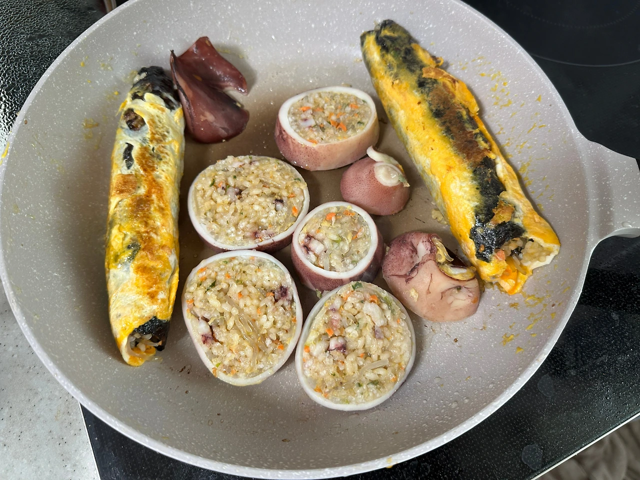 어제 순대속을 만들고 납은 찹쌀밥은 김에 싸서 계란에 한번 부쳐뒀다. 튀김을 했다면 더 좋았겠지만 그럴 여력까진 없어서, 간단히 계란김밥 서타일로만 하는 걸로. 바깥양반이 드라이를 하는 동안 계란김밥과, 오징어 순대를 치익치익 그을려가며 굽는다. 요리를 하고자한 나의 열망과 그것을 먹고자 하던 바깥양반의 열망이 결합된 오징어순대. 요리를 하는 건 이런 보람있는 일이다.