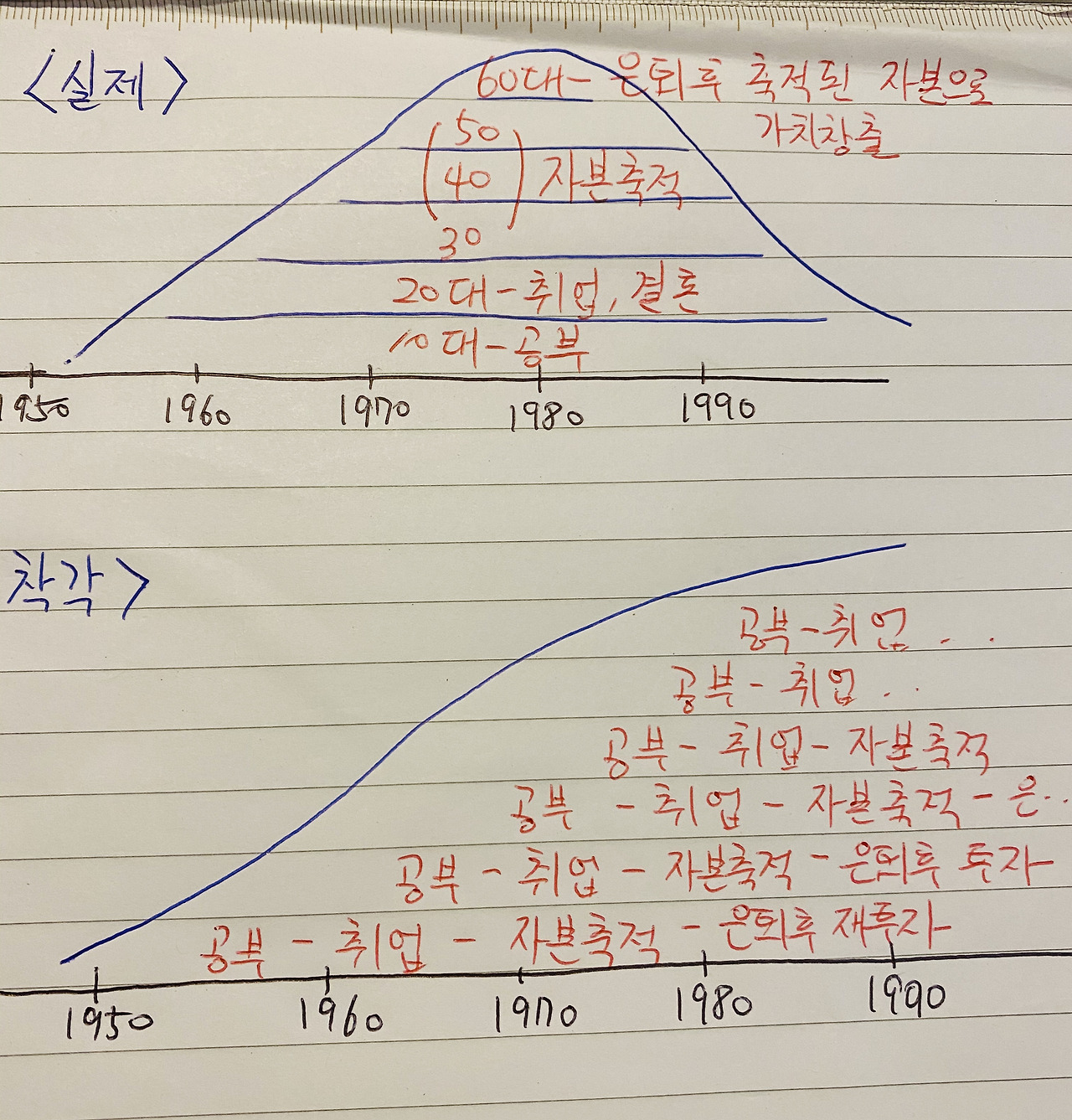 10대에 열공, 20대에 대학과 취업, 30대부터 50대까지 자본축적, 60대에 은퇴한 뒤 축적된 자본으로 재투자, 그 뒤에 안락한 여생.