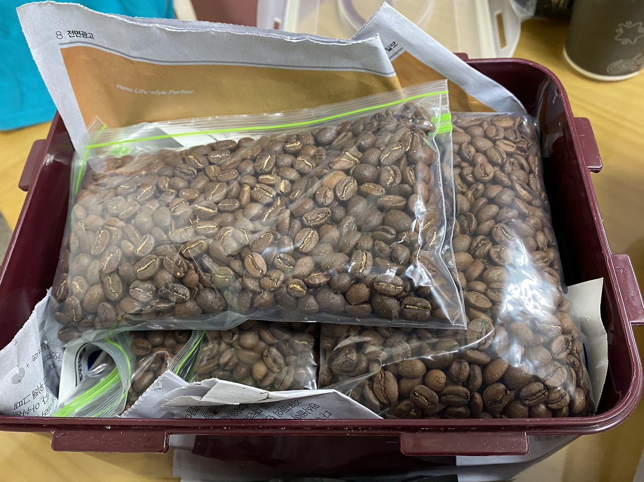 오늘 학교에 출근해서 재택근무를 결재 상신한 뒤에 앞에 있는 슈퍼에 들렀다. 지퍼백을 사서는 원두를 적당량씩 담았다. 촤라락-. 원두가 달그락거리며 떨어져 부딪히는 소리가 언제 들어도 기분이 좋다. 게다가 1Kg의 원두 봉투를 뜯는 순간의 그 강렬한 향기는 얼마나 좋던지. 집에서 통도 준비를 해 갔다. 김치를 담던 통이라 심하진 않지만 냄새가 조금 났다. 신문지를 깔았다. 다른 큰 통을 사왔어야 할까 생각도 들었지만 일단 신문지가 어느정도 역할은 해줄 수 있길 기원했다.