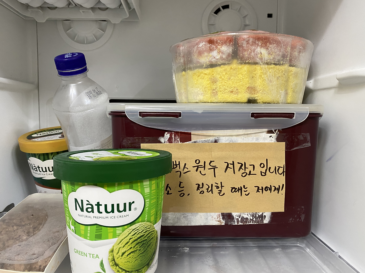 소분을 금새 마치고 테이프와 포스트잇을 가져와 통에 이리저리 표시를 했다. 공유냉동고이니 사람들이 모르고 치울 수 있다. 특히나 방학 때는 주의해야 한다. 누가 훔쳐가거나 할 일은 없지만 교사란 사람들은 거추장스럽고 수상한 것이 보이면 여지없이 치워버리는 본능이 있다. 필사적으로 이 원두의 중요성을 알려야 했다. 덕지덕지 라는 말이 어울릴만큼 과하게 표시를 해 두었다. 신나고 재미있게 소분 냉동을 마쳤다. 이제 하나씩 꺼내서 해동한 뒤에 마시기만 하면 된다.