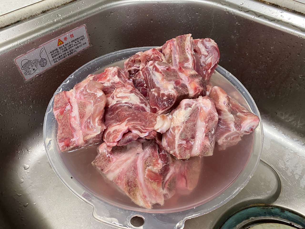 그런데 아침이 되어 해동된 고기를 물에 헹구려 꺼내보니...어? 등뼈다. 돼지 등뼈다. 그것도 어마어마한 양의, 돼지등뼈다.