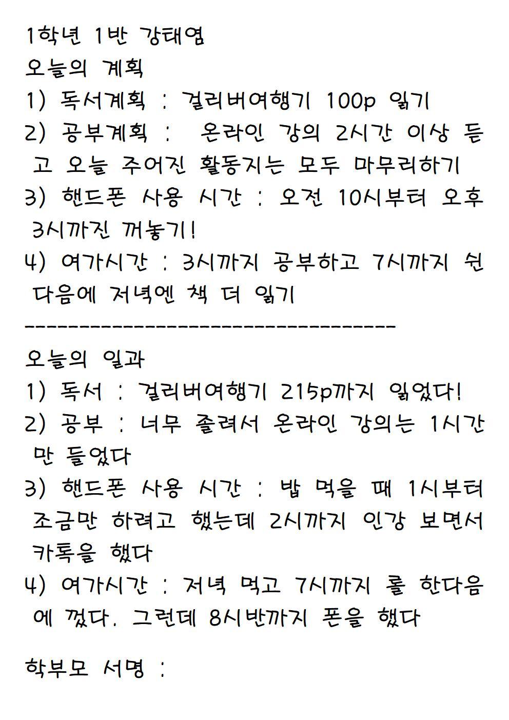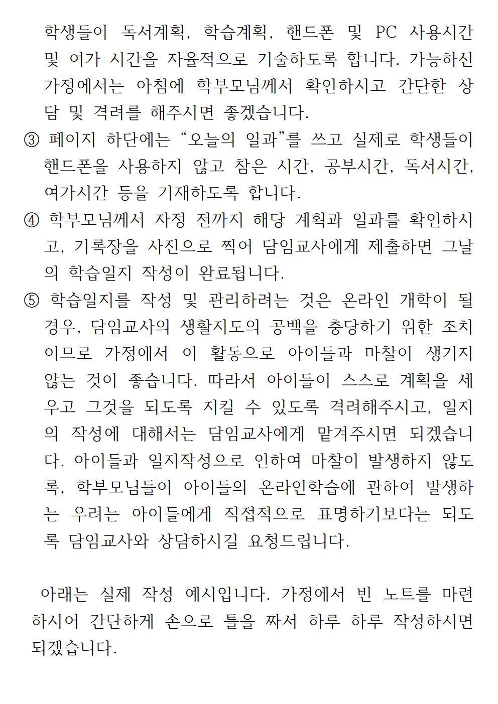 부장교사들이 이 방안에 동의한다면 우리 학교에서 위 대책이 시행되는 것이고, 동의하지 않는다면 시행되지 않는다. 내가 짐작하기에는 고3은 몰라도 고1,2에선 충분히 효과가 있을 수 있는 방안이고, 이것을 교사들이 제출받아 상담 및 출결확인자료로 쓴다면 온라인학습의 느슨함이 조금이나마 해결될 것으로 보인다.