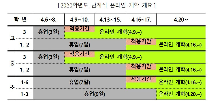 교육부에서는 당연히 상황을 인지하고 급별로 유예기간을 두었지만, 일반적인 수업 재구성도 길게는 1년 짧게는 한학기는 꼴아박고 말아먹기 마련인데 온라인 개학이 잘 될리가. 많은 교사들이 나몰라라 온라인 수업을 대강 처리할 것이고, 당연히 많은 학생들도 나몰라라 온라인 수업을 대강 듣는 시늉을 할 것이다. 속이 타는 학부모만이 뒤에 남아 아이과 싸운다.