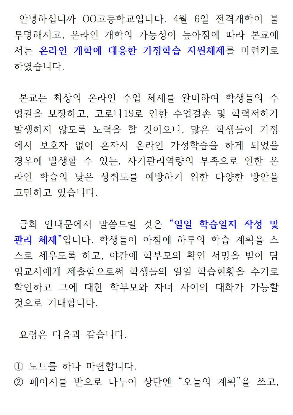 학교에 위와 같은 대책을 지속적으로 요구해서 언제가 될지 모르는 오프라인 전면 개학 때까지, 학교가 학생들을 관리할 수 있는 대책을 지속적으로 낼 수 있도록 해야 한다. 이처럼 간략하고 단순한 양식이 아니라, 진로활동, 봉사활동, 독서활동에까지 가정에서 학교의 조력이 미칠 수 있는 안을 학교는 내야 하고, 학부모는 그것을 요구할 권리가 있다.